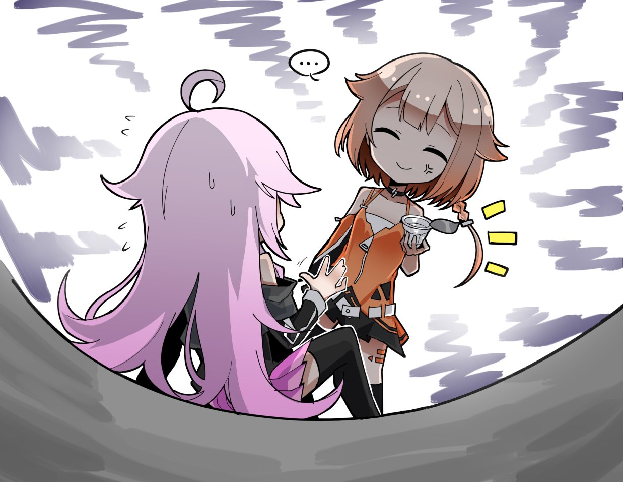2girls ahoge anger_vein asymmetrical_sleeves bad_id bad_twitter_id black_legwear black_shirt black_skirt braid braided_ponytail cevio chibi closed_eyes collar cup digging_your_own_grave false_smile hand_up holding holding_cup ia_(vocaloid) long_hair multiple_girls on_ground one_(cevio) orange_shirt pink_hair platinum_blonde_hair shidoh279 shirt short_hair skirt smile spaghetti_strap standing sweat thighhighs uneven_sleeves vocaloid