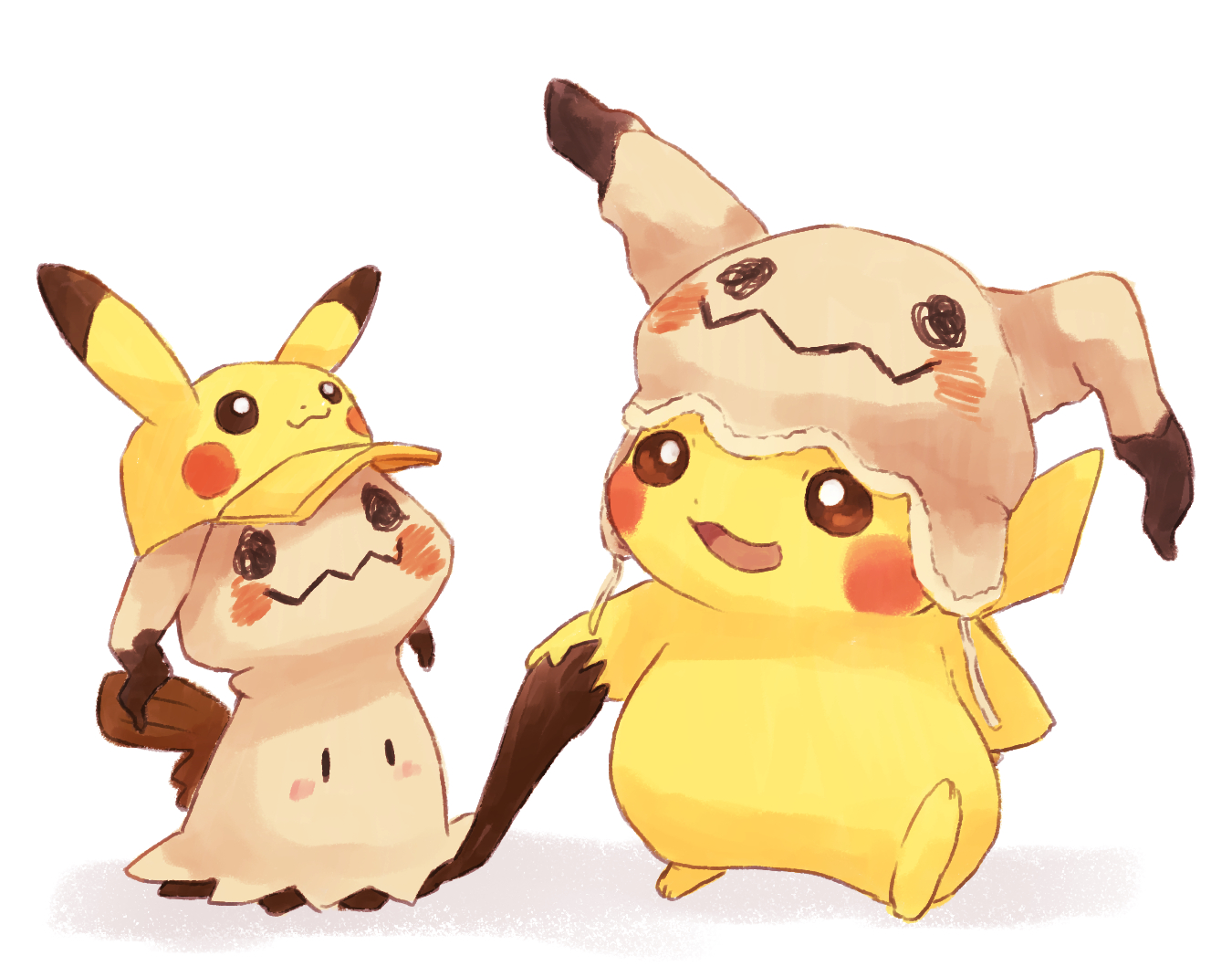 baseball_cap beanie blush_stickers brown_headwear character_hat clothed_pokemon commentary_request cosplay fur_trim gen_1_pokemon gen_7_pokemon hat hat_with_ears holding_hands looking_at_another mimikyu mimikyu_(cosplay) misonikomiii nintendo pikachu pikachu_(cosplay) pokemon print_headwear simple_background walking white_background yellow_headwear