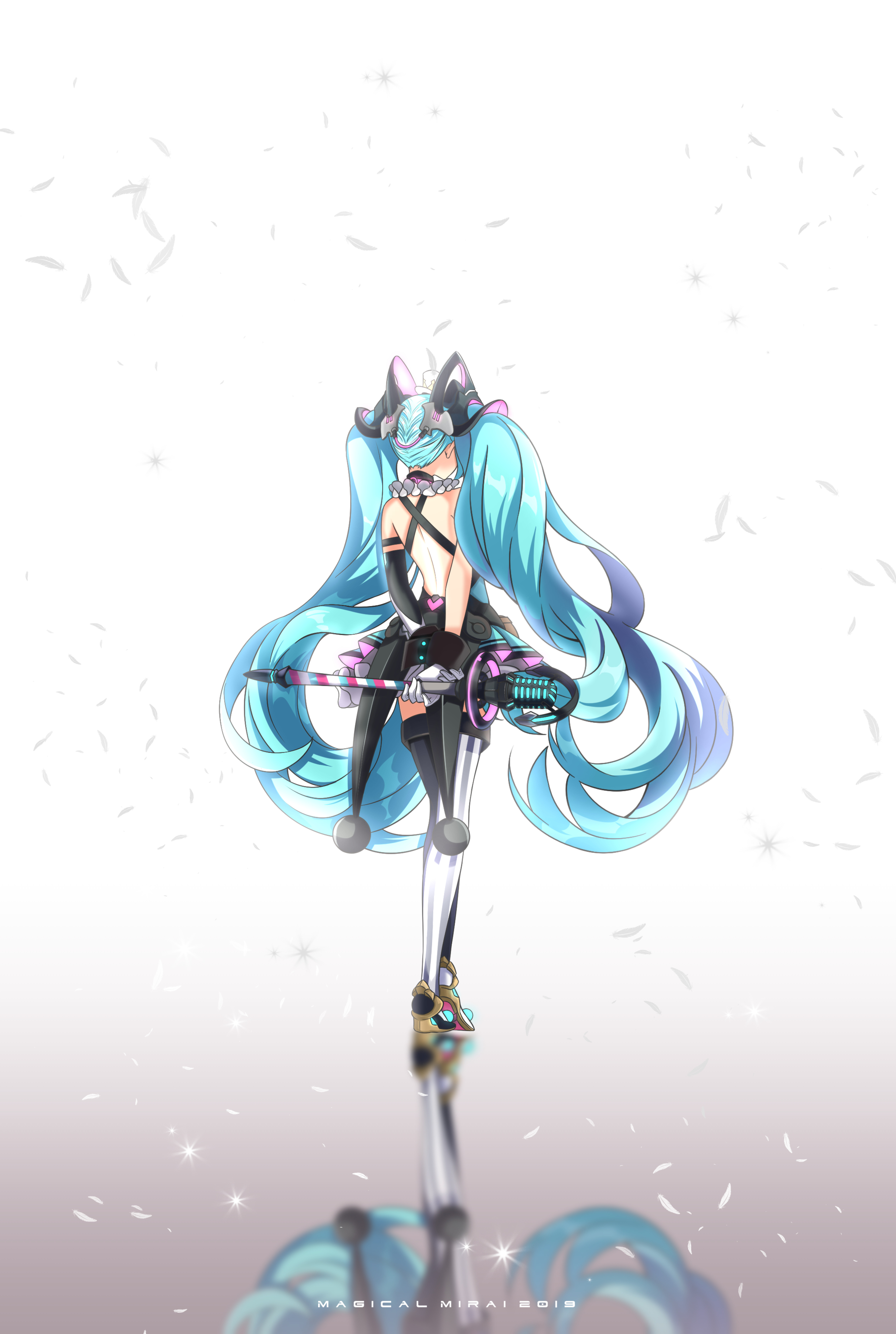 1girl absurdres aqua_hair balloon cube diamond_(shape) full_body hair_ornament hat hatsune_miku headphones highres holding holding_microphone holding_wand long_hair magical_mirai_(vocaloid) magical_mirai_miku magical_mirai_miku_(2019) megaphone microphone microphone_stand microphone_wand mini_hat mini_top_hat necktie number_tattoo reflection short_necktie standing tattoo top_hat twintails very_long_hair vocaloid wand yuuta_(yuuta0312)