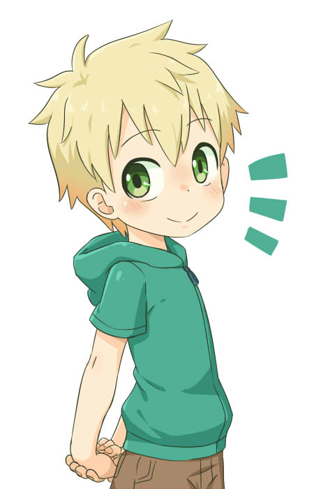 1boy ^^^ blonde_hair blush commentary green_eyes hair_between_eyes hood hoodie jqk looking_at_viewer male_focus original simple_background smile solo white_background