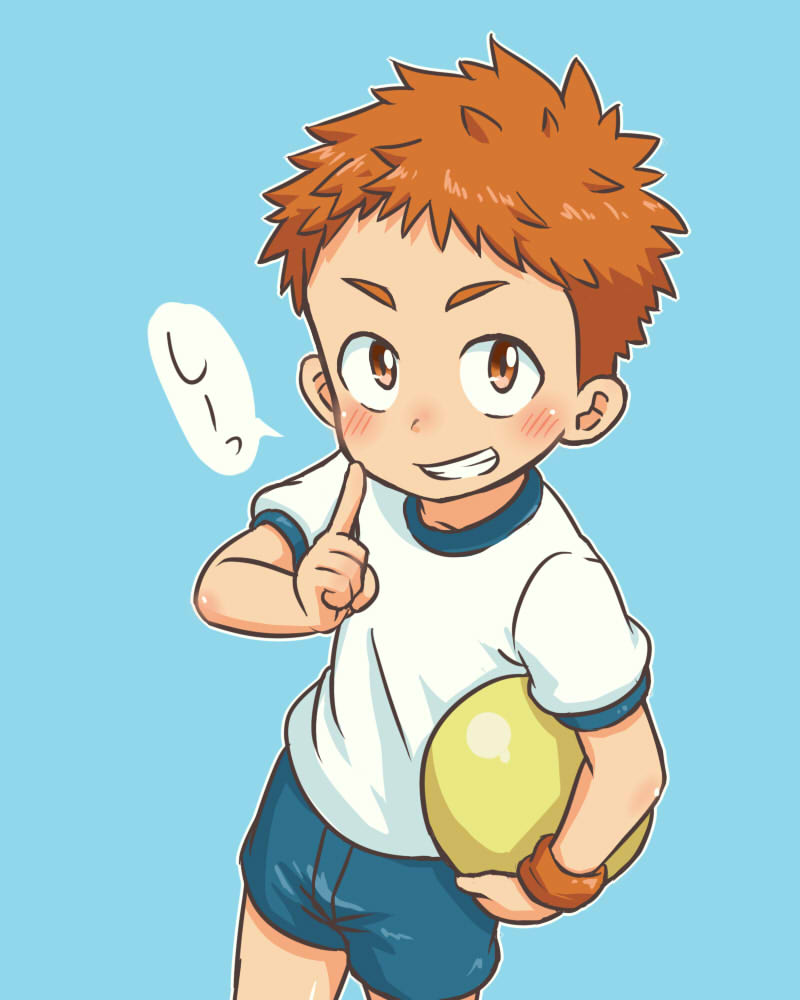 1boy ball blue_background blush brown_eyes brown_hair grin gym_uniform jqk looking_at_viewer looking_up male_focus original shorts simple_background smile solo