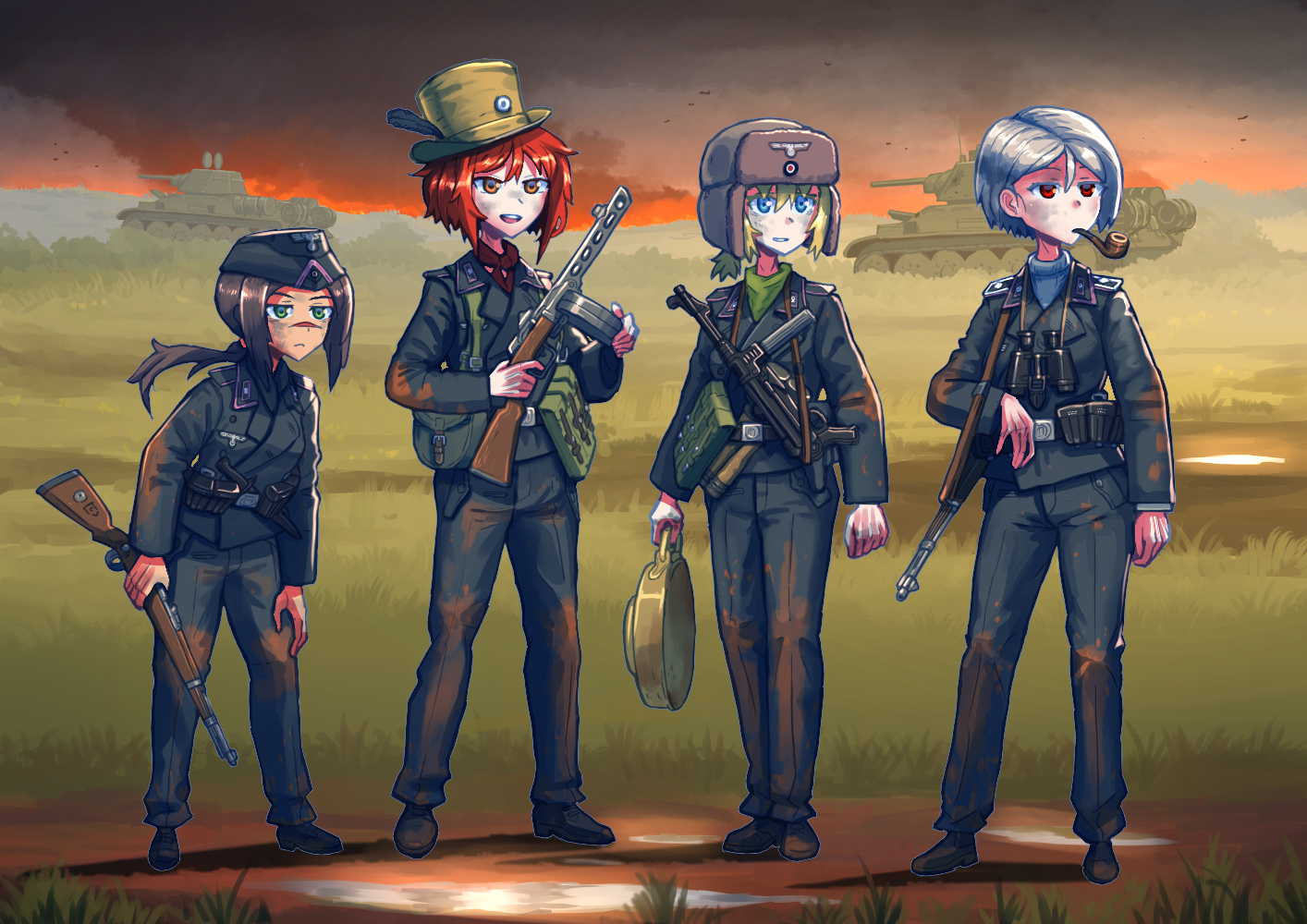 4girls :d aircraft airplane belt binoculars blue_eyes blush bolt_action brown_hair dark-skinned_female dark_skin dirty dirty_clothes erica_(naze1940) explosive fire full_body garrison_cap grass green_eyes grin gun hat hat_feather holding holding_gun holding_weapon knife long_hair mauser_98 military military_uniform military_vehicle mine_(weapon) motor_vehicle mp40 multiple_girls open_mouth orange_eyes orange_hair original ponytail pouch red_eyes rifle scar sheath sheathed short_hair silver_hair smile smoking_pipe standing submachine_gun tank teeth top_hat weapon world_war_ii
