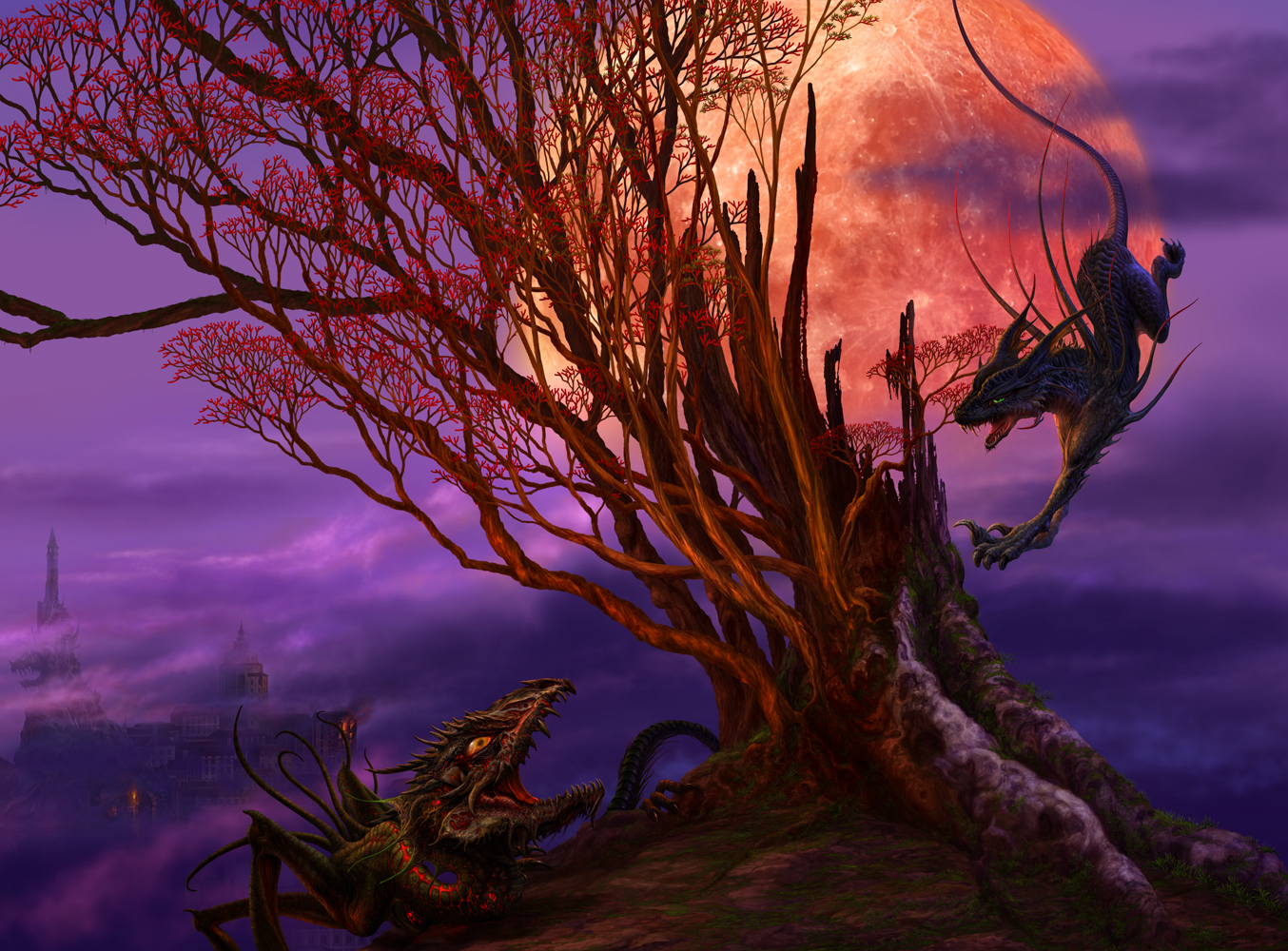 battle castle claws cloud creature fantasy full_moon green_eyes kazumasa_uchio moon no_humans original scenery tail tree uchio_kazumasa