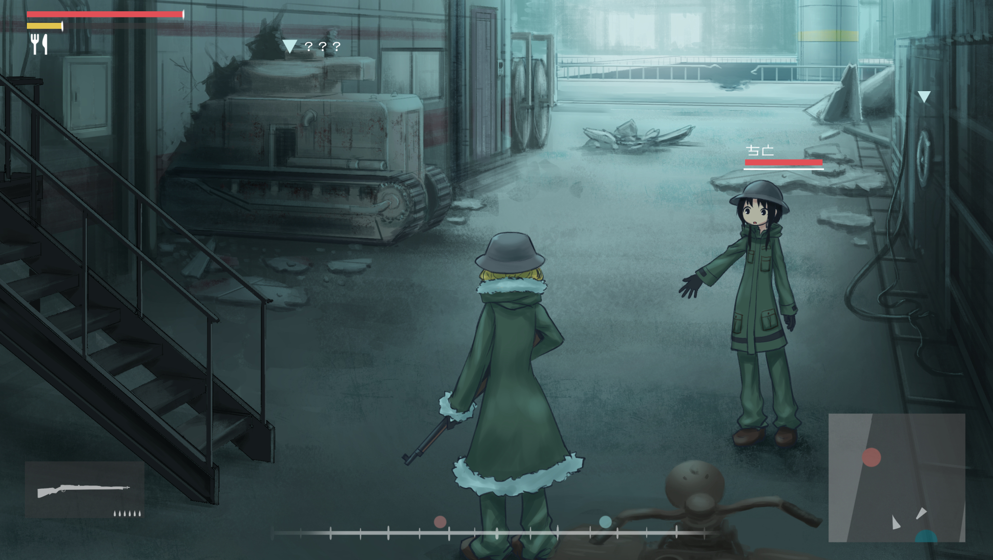 2girls ? black_eyes black_gloves black_hair blonde_hair brodie_helmet building cable caterpillar_tracks character_name chito_(shoujo_shuumatsu_ryokou) combat_helmet commentary_request dark facing_away fake_screenshot fork fur_trim gloves green_pants gun handlebar heads-up_display health_bar helmet highres hood hood_down kettenkrad knife long_hair long_sleeves military military_vehicle motor_vehicle multiple_girls pants railing rifle roke_(taikodon) rubble ruins shoes shoujo_shuumatsu_ryokou stairs standing symbol tank tank_(container) user_interface weapon wide_shot yuuri_(shoujo_shuumatsu_ryokou)