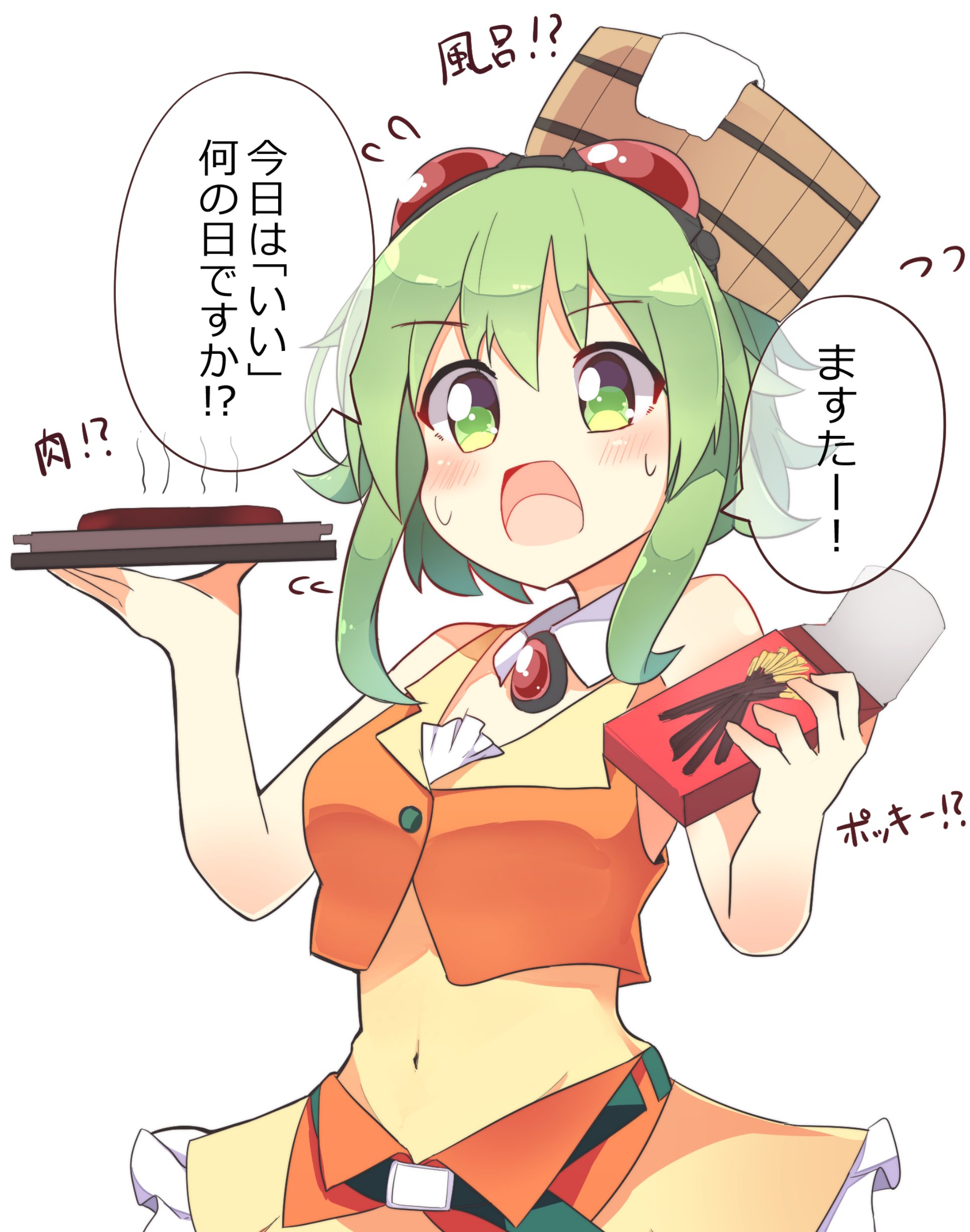 absurdres amulet blush box bucket bucket_on_head collar commentary crop_top date_pun detached_collar food frilled_skirt frills goggles goggles_on_head green_eyes green_hair gumi hands_up highres holding holding_box holding_tray meat navel number_pun object_on_head orange_shirt orange_skirt pachio_(patioglass) pocky red_goggles shirt short_hair short_hair_with_long_locks sidelocks skirt sleeveless sleeveless_shirt solo speech_bubble sweatdrop towel translated tray vocaloid white_collar