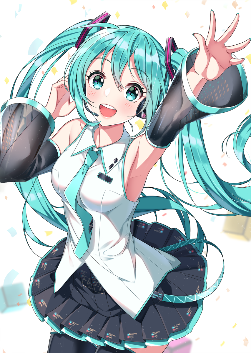 1girl :d aqua_eyes aqua_hair aqua_necktie arm_up armpits bare_shoulders black_skirt black_sleeves black_thighhighs blush breasts circle_skirt collared_shirt commentary detached_sleeves female_focus hair_between_eyes hair_ornament hand_up hatsune_miku headphones headset highres long_hair long_sleeves medium_breasts necktie open_mouth outstretched_arm pleated_skirt see-through_clothes see-through_sleeves shirt skirt sleeveless sleeveless_shirt smile solo sutoroa teeth thighhighs twintails upper_teeth_only very_long_hair vocaloid white_background white_shirt wide_sleeves
