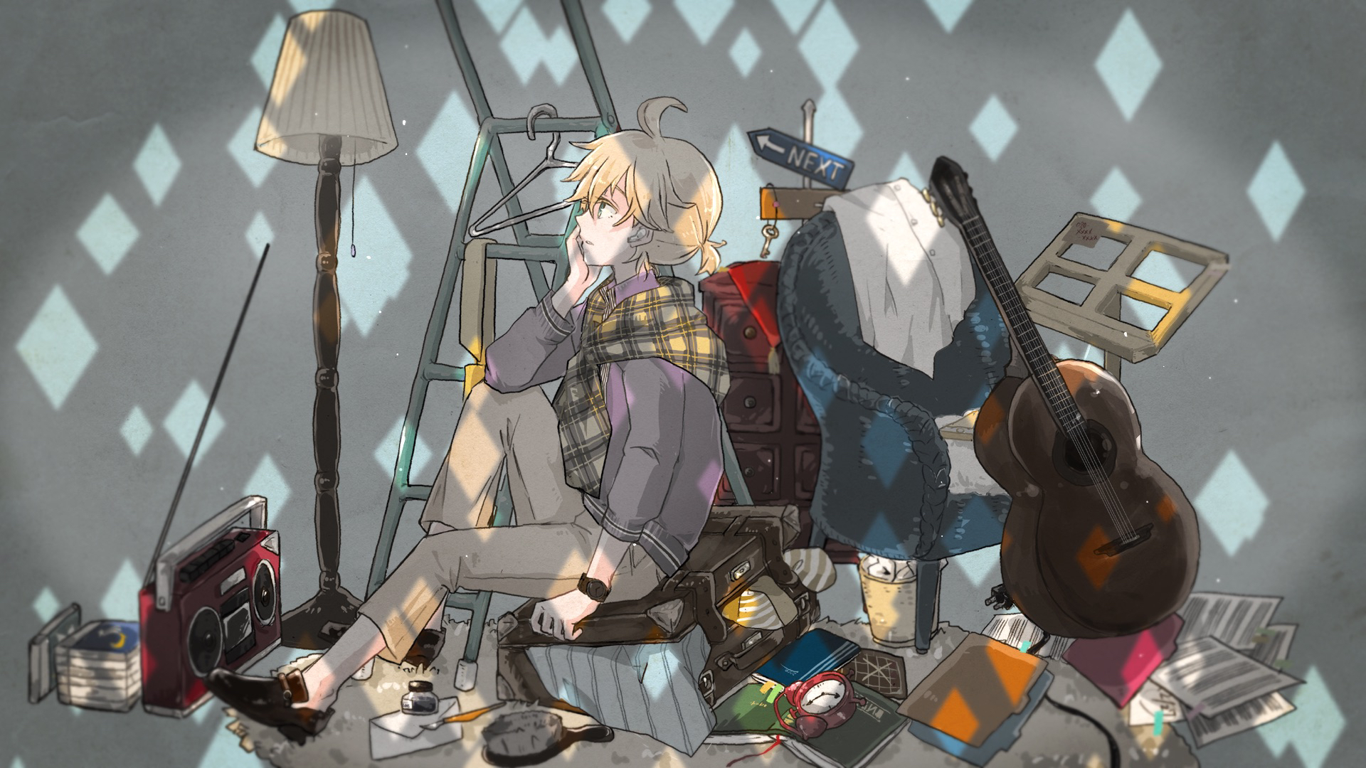 1boy acoustic_guitar ahoge alarm_clock blonde_hair blue_eyes book brush cabinet cable clock clothes_hanger commentary crumpled_paper diamond_(shape) envelope folder from_side guitar hand_on_own_cheek hand_on_own_face highres ink_pen inkwell instrument kagamine_len key knee_up lamp light looking_up male_focus mary_janes music_stand necktie nib_pen_(object) pants parted_lips pen plaid_clothes plaid_scarf ponytail purple_shirt radio radio_antenna rug sakanashi scarf sheet_music shirt shoes short_hair short_ponytail signpost sitting suitcase thinking trash_can vocaloid watch wide_shot wristwatch yellow_neckwear