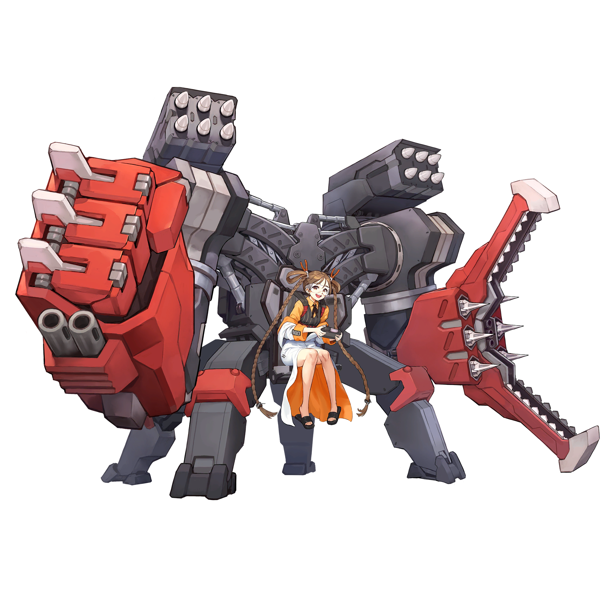 1girl braid brown_eyes brown_hair doctor_(last_origin) female_focus full_body game_cg hair_pliers hair_rings highres lab_coat last_origin long_hair looking_at_viewer official_art open_mouth pliers power_suit safety_glasses sandals shirt sitting smile solo tachi-e transparent_background twin_braids very_long_hair vest