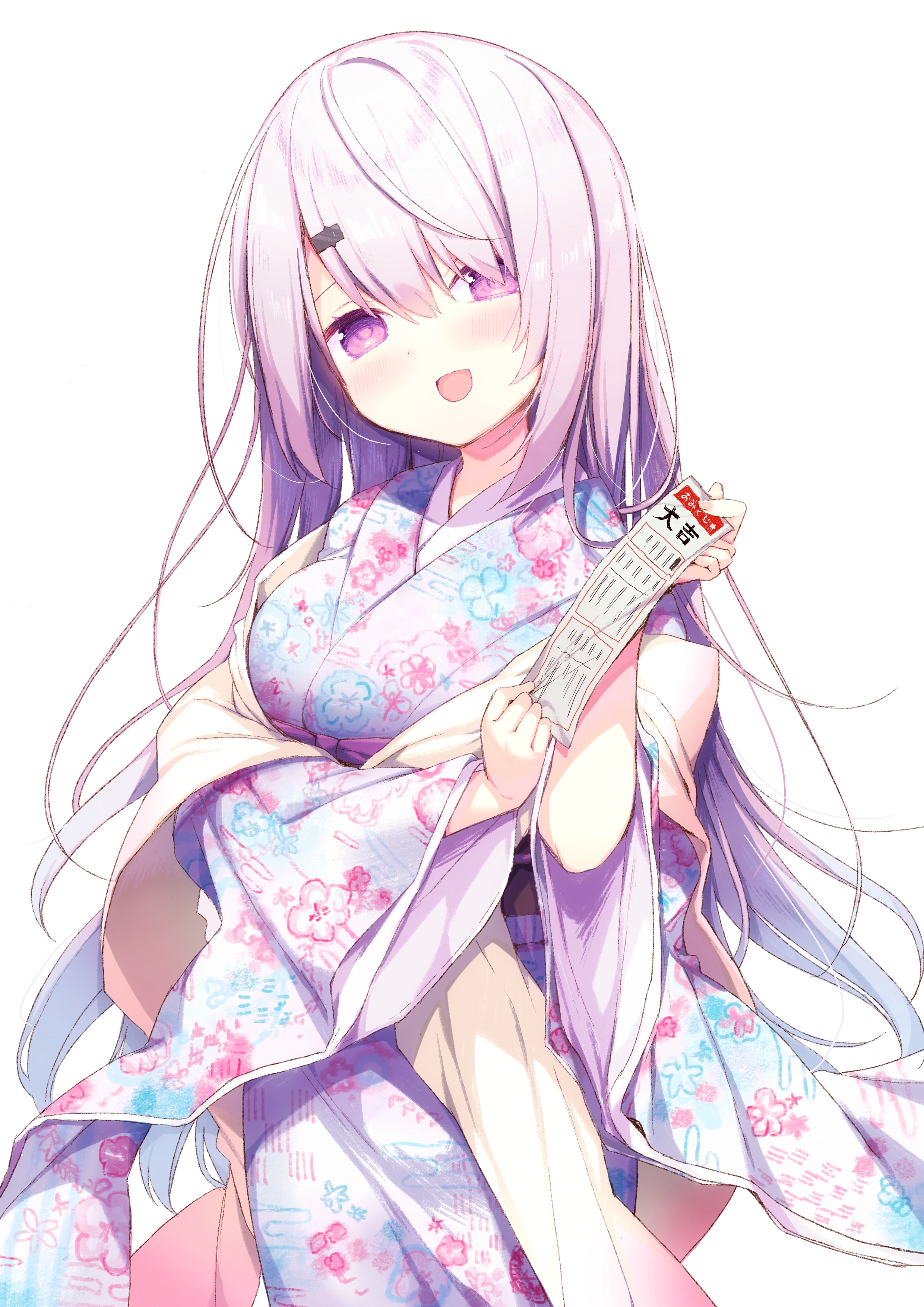 1girl absurdres blush female_focus floral_print furisode hair_between_eyes hair_down hair_ornament hairclip haori highres hisagi_(puchimaple) holding holding_paper japanese_clothes kimono long_hair long_sleeves looking_at_viewer nijisanji obi omikuji open_mouth paper pink_hair red_eyes sash shiina_yuika simple_background smile solo very_long_hair virtual_youtuber white_background wide_sleeves