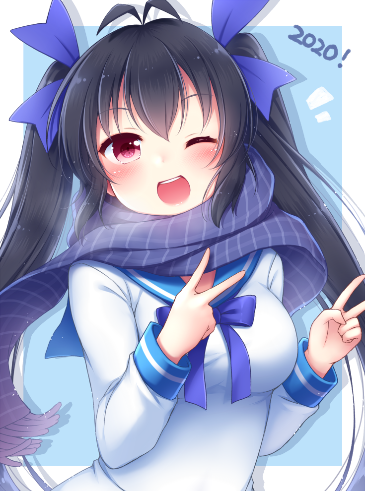 1girl 2020 ;d ^^^ antenna_hair blue_background blue_ribbon blue_sailor_collar blue_scarf blush breasts breath chunithm commentary_request double_v female_focus fringe_trim hair_ribbon hakobe_naru irodorimidori large_breasts long_hair long_sleeves looking_at_viewer medium_breasts one_eye_closed open_mouth pink_eyes ribbon sailor_collar sanotsuki scarf school_uniform serafuku shirt smile solo striped_clothes striped_scarf teeth twintails two-tone_background upper_body upper_teeth_only v very_long_hair white_shirt