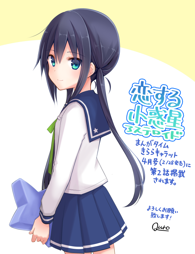 1girl announcement_celebration aqua_eyes artist_name blue_hair blue_serafuku blue_skirt commentary_request copyright_name female_focus from_side green_ribbon holding holding_star koisuru_asteroid looking_at_viewer looking_to_the_side low_twintails manaka_ao manga_time_kirara official_art plaid_clothes plaid_skirt quro_(black_river) ribbon school_uniform serafuku sidelocks signature skirt solo star_(symbol) translation_request twintails