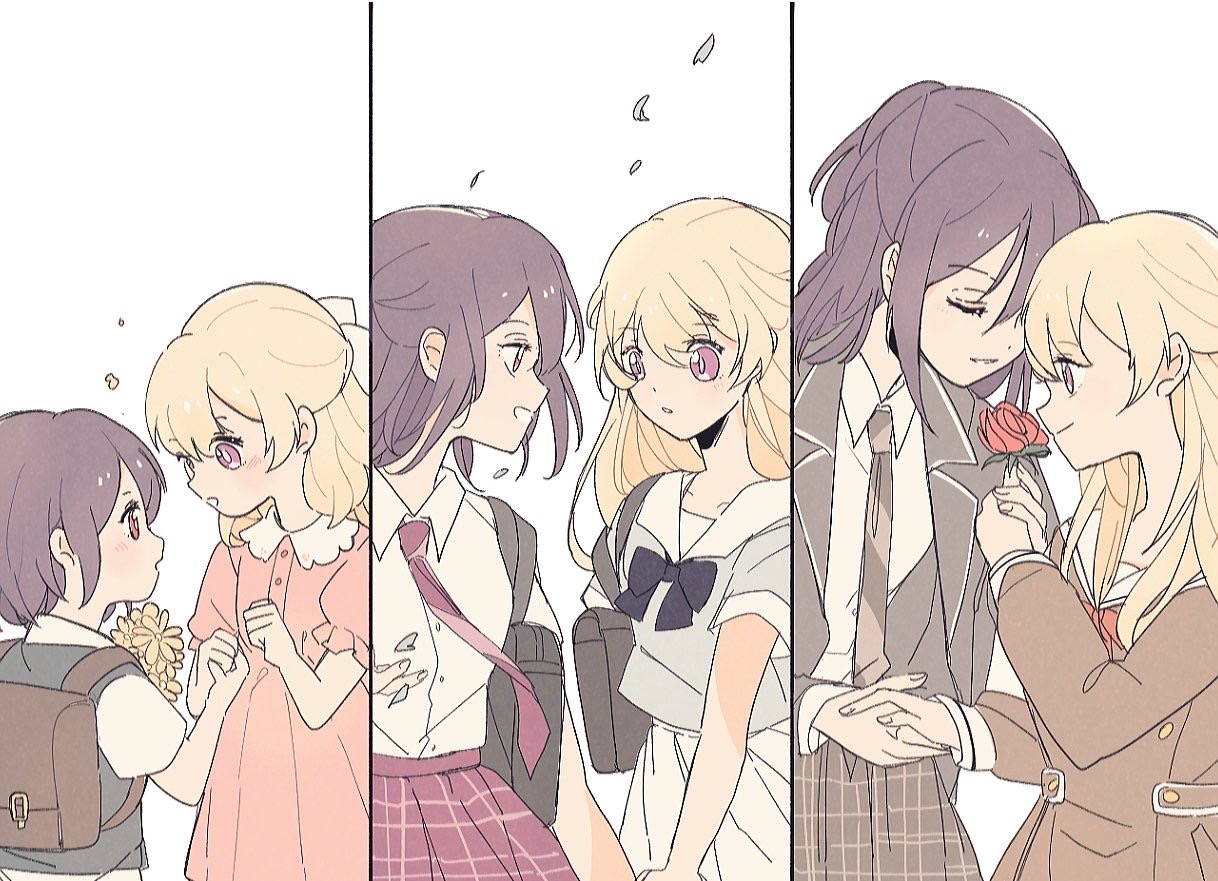 2girls age_progression aged_down backpack bag bang_dream! bang_dream!_girls_band_party! black_skirt blazer blonde_hair bouquet bow bowtie brown_dress child dress flower frilled_skirt frills grey_jacket grey_neckwear hair_ribbon half_updo holding holding_bouquet holding_flower holding_hands jacket long_hair long_sleeves looking_at_another multiple_girls neck_ribbon necktie petals pink_dress plaid_clothes plaid_skirt purple_eyes purple_hair purple_neckwear purple_skirt red_flower red_neckwear red_rose ribbon rose sailor_dress school_bag seri_(vyrlw) seta_kaoru shirasagi_chisato short_hair short_sleeves sidelocks skirt striped_clothes striped_necktie striped_neckwear white_ribbon yellow_flower yuri