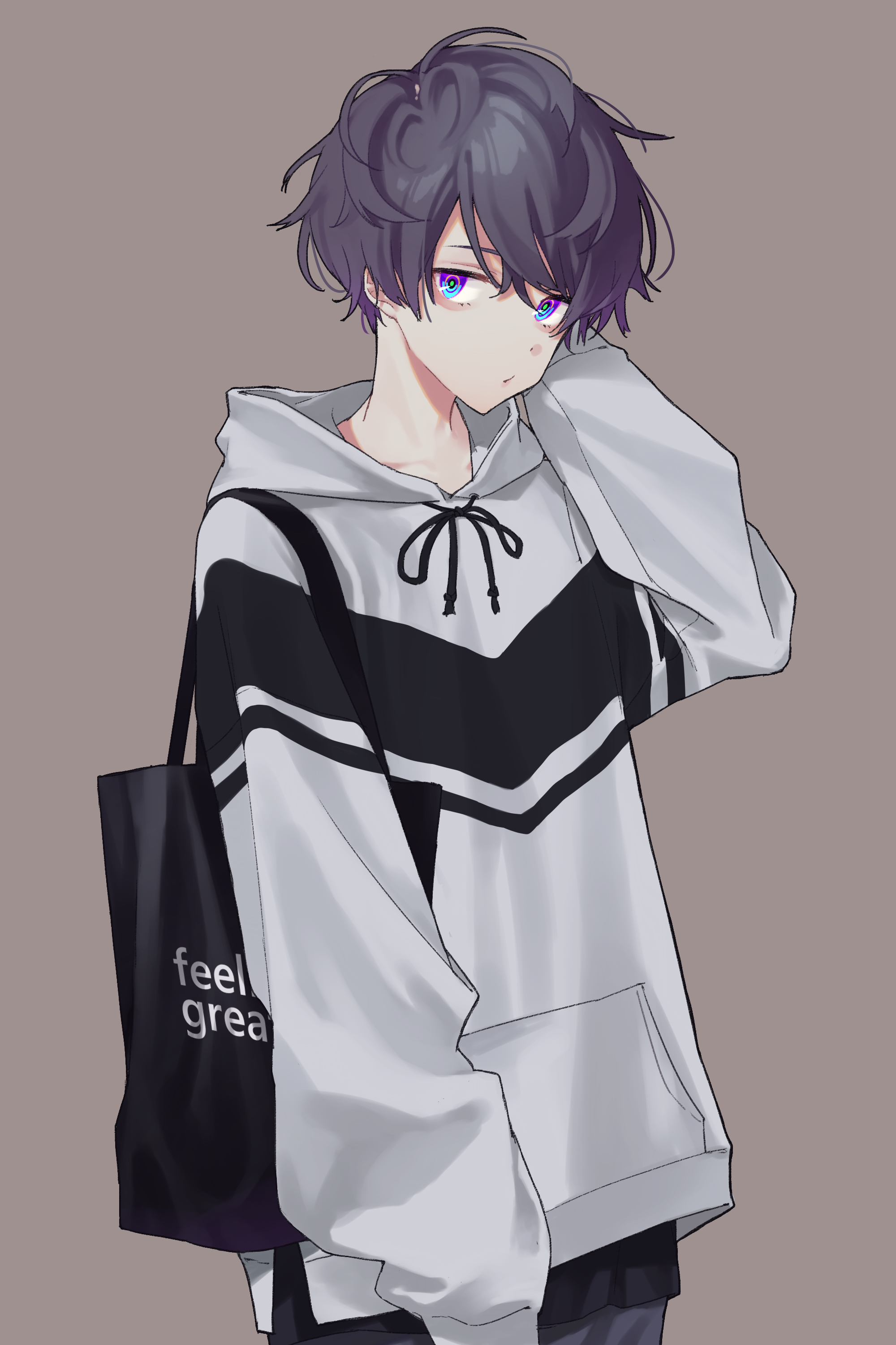 1boy absurdres aiko_(aiko_54) androgynous arm_at_side arm_behind_head arm_up bag bags_under_eyes blue_eyes closed_mouth collarbone crossed_bangs drawstring expressionless from_side gradient_hair grey_hoodie hair_between_eyes highres hood hood_down hoodie indie_utaite long_sleeves looking_at_viewer male_focus messy_hair multicolored_eyes multicolored_hair niconico purple_hair shoulder_bag simple_background solo sou_(utaite) swept_bangs utaite