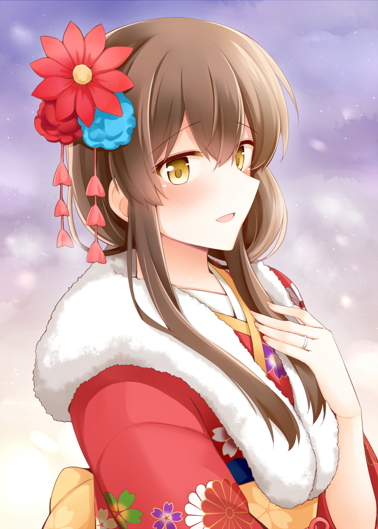 1girl :d akagi_(kancolle) akagi_(new_year)_(kancolle) brown_hair female_focus floral_print flower fur_trim hair_flower hair_ornament japanese_clothes jewelry kantai_collection kimono long_hair looking_at_viewer muneate open_mouth red_kimono ring rui_shi_(rayze_ray) smile solo upper_body wedding_band