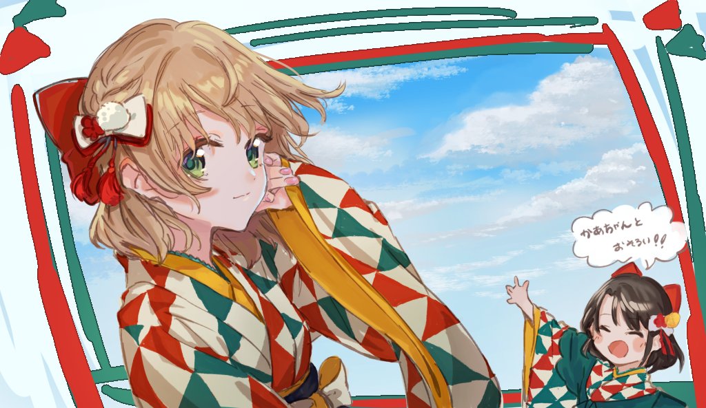 bad_id bad_twitter_id black_hair blue_sky blush bow closed_eyes closed_mouth cloud furisode genmaicha_oishii green_eyes hair_bow hololive indie_virtual_youtuber japanese_clothes kimono light_brown_hair long_sleeves looking_at_viewer nail_polish obi oozora_subaru oozora_subaru_(new_year) open_mouth pink_nails red_bow sash shigure_ui_(vtuber) short_hair sketch sky smile taishou upper_body virtual_youtuber waving white_bow wide_sleeves