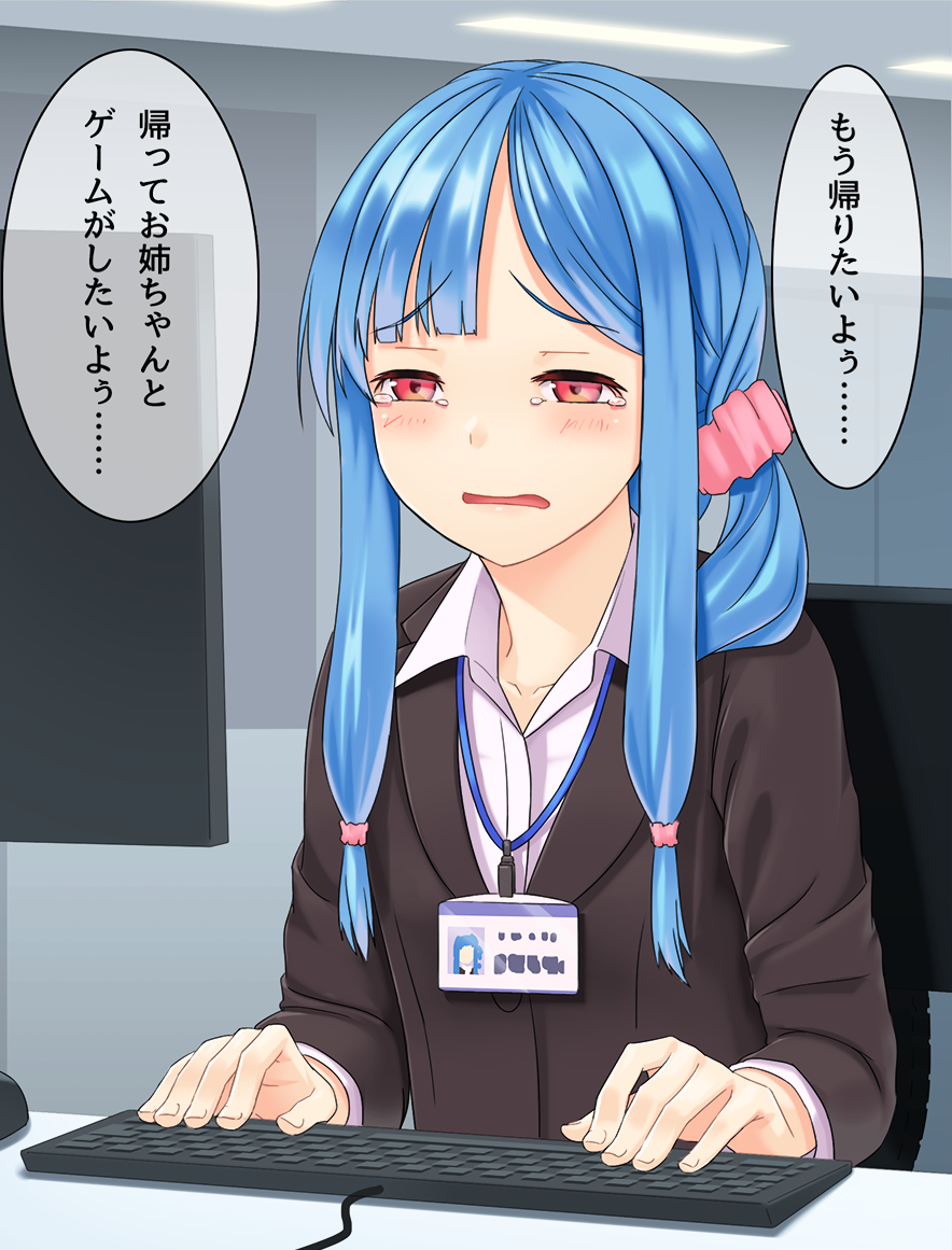 1girl at_computer black_jacket blue_hair blush chair collarbone commentary computer_keyboard female_focus fluorescent_lamp furrowed_brow hair_tie half-closed_eyes id_card indoors jacket kotonoha_aoi kurione_(zassou) long_hair monitor office open_mouth pink_shirt ponytail red_eyes shirt sidelocks solo speech_bubble tears translated typing voiceroid