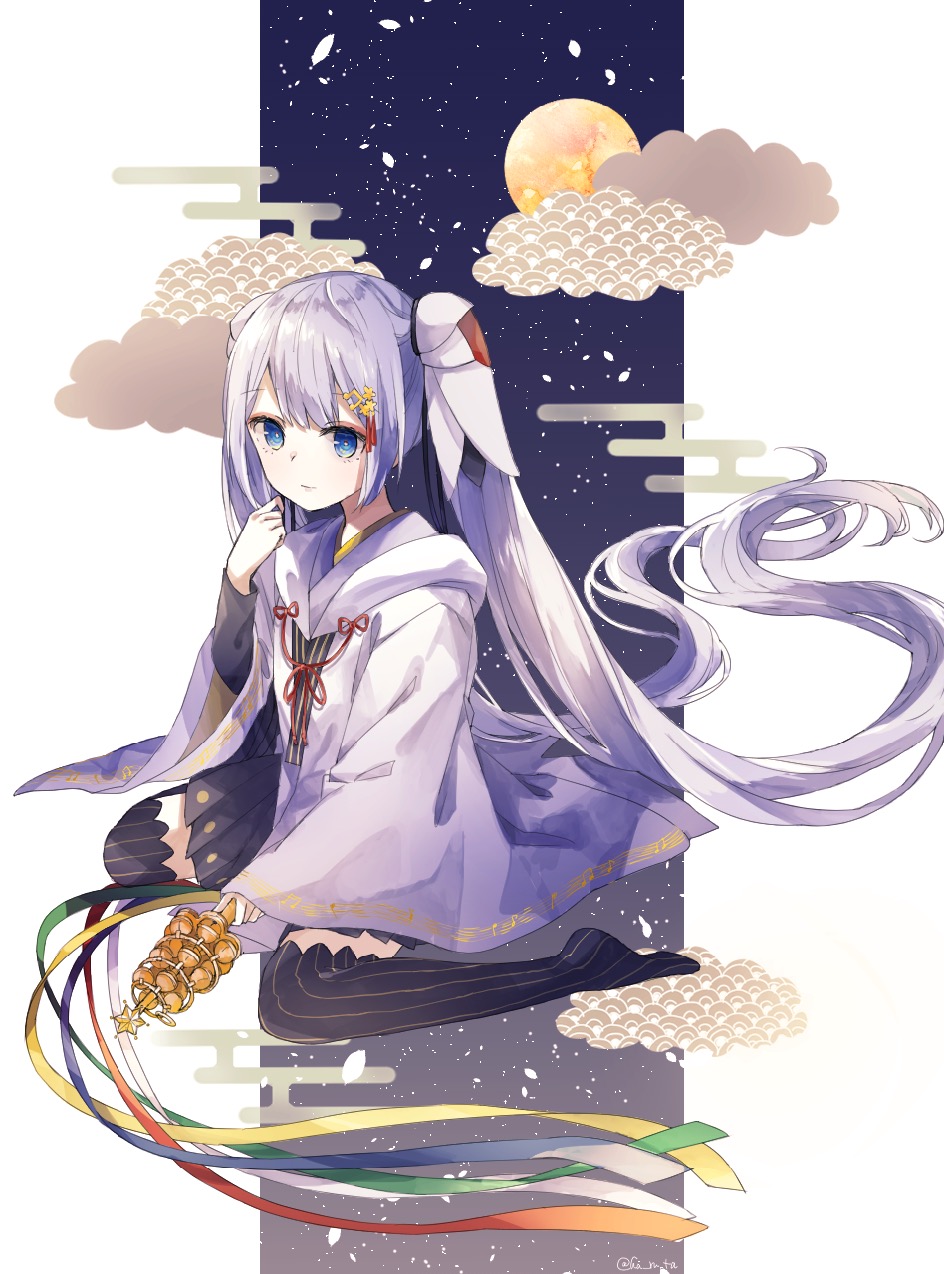 1girl bell blue_eyes cloud commentary egasumi female_focus full_body hair_ornament hairclip hand_up haruta_(user_dndp3458) hatsune_miku highres holding holding_instrument hood instrument japanese_clothes jingle_bell kagura_suzu kimono light_smile looking_at_viewer moon night ribbon seigaiha sitting sky solo star_(sky) starry_sky striped_clothes striped_thighhighs thighhighs vocaloid white_hair white_kimono wide_sleeves yuki_miku yuki_miku_(2018)