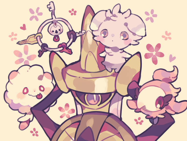 aegislash bad_id bad_pixiv_id brown_eyes closed_mouth creature espurr expressionless eyelashes floating flying gen_6_pokemon heart key klefki looking_at_viewer maru_(umc_a) nintendo no_humans on_head pokemon pokemon_(creature) pokemon_on_head purple_eyes red_eyes shield simple_background single_eye smile spritzee standing swirlix sword tongue tongue_out weapon