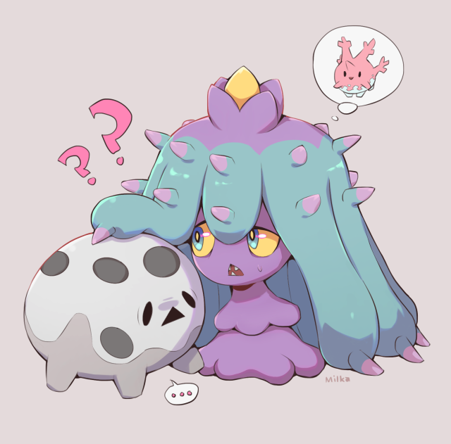 ... ? ?? artist_name blue_eyes colored_sclera commentary corsola creature english_commentary frown full_body galarian_and_normal galarian_corsola galarian_form gen_2_pokemon gen_7_pokemon gen_8_pokemon grey_background horns mareanie milka_(milk4ppl) nintendo no_humans pokemon pokemon_(creature) signature simple_background speech_bubble standing sweat thought_bubble yellow_sclera