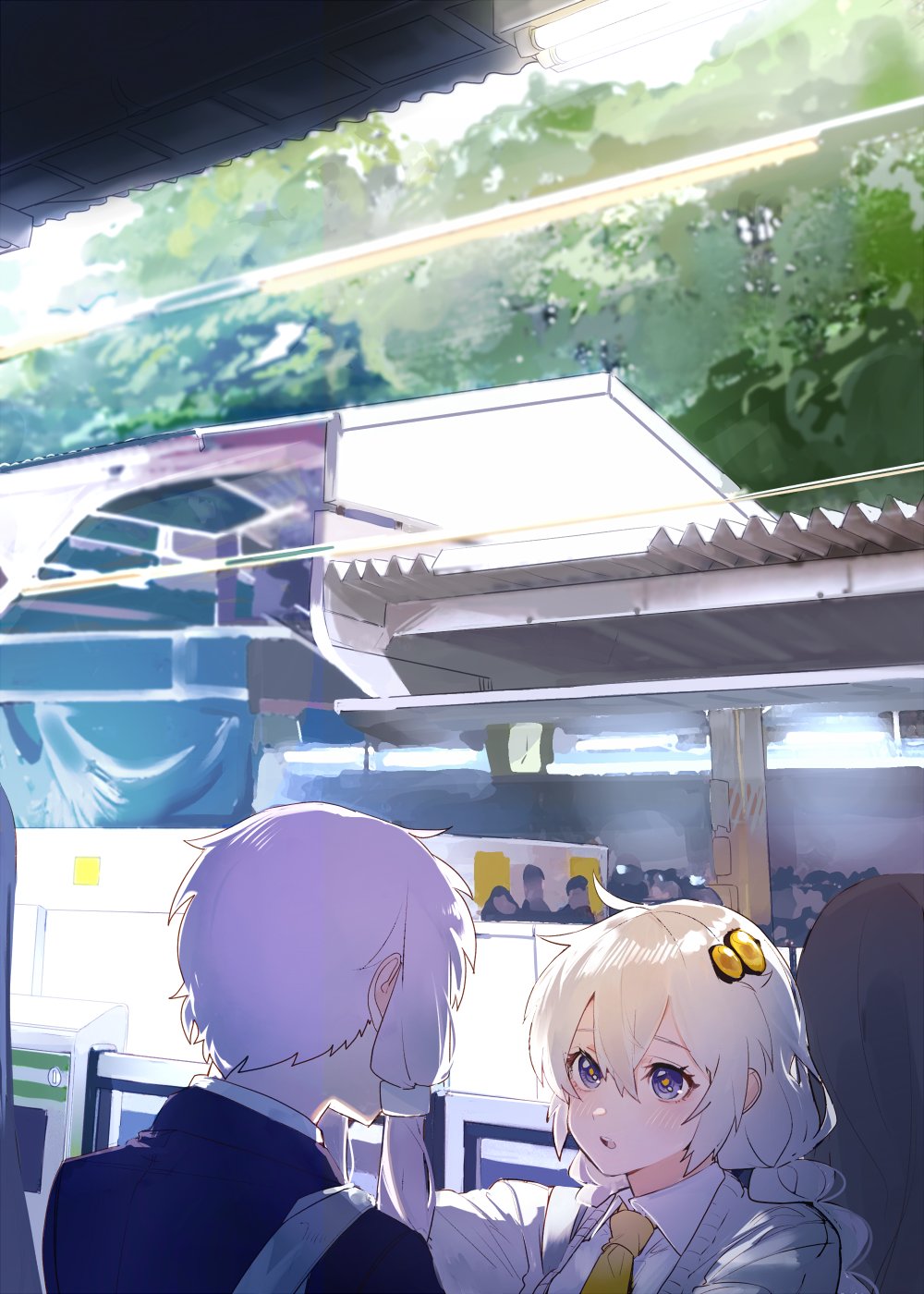 2girls blue_eyes blurry blurry_background blush braid cardigan commentary corrugated_galvanized_iron_sheet crowd day facing_another fluorescent_lamp hair_ornament hair_tubes highres jacket kizuna_akari light_blush multiple_girls necktie open_mouth outdoors purple_hair school_uniform shirt short_hair_with_long_locks sidelocks train_station twin_braids v_cho3 vocaloid voiceroid white_hair white_shirt yellow_neckwear yuzuki_yukari