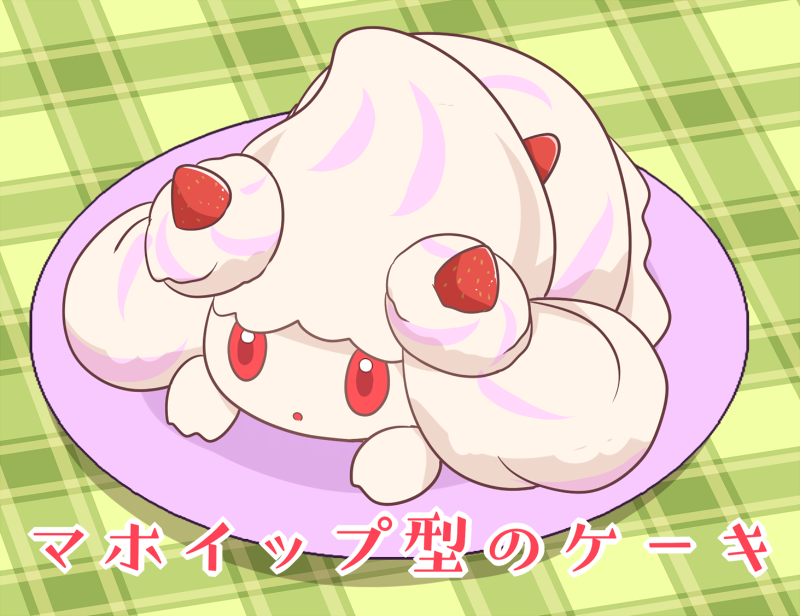 4koma alcremie alcremie_(strawberry_sweet) alcremie_(vanilla_cream) cake comic commentary_request derivative_work food fruit gen_8_pokemon ice_cream illusion_cake meme mori_no_kaeru nintendo no_humans parody plate pokemon pokemon_(creature) red_eyes segmented_comic strawberry table translation_request