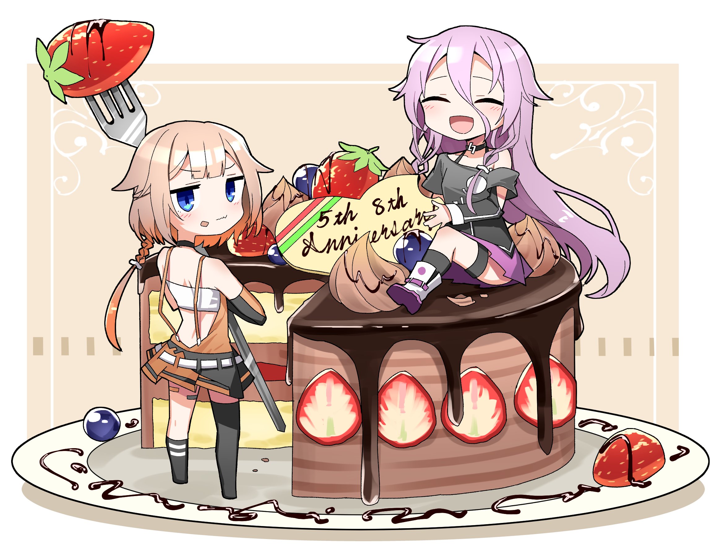 2girls anniversary asymmetrical_legwear bad_id bad_twitter_id birthday_cake blue_eyes blueberry braid cake cevio chibi chocolate closed_eyes collar commentary food food_on_face fork fruit full_mouth grey_shirt highres holding holding_fork ia_(vocaloid) kneehighs long_hair looking_at_viewer looking_back mini_person minigirl multiple_girls off-shoulder_shirt off_shoulder one_(cevio) open_mouth pink_hair pink_skirt plate platinum_blonde_hair shidoh279 shirt short_hair single_thighhigh skirt smile socks strawberry thighhighs uneven_legwear very_long_hair vocaloid