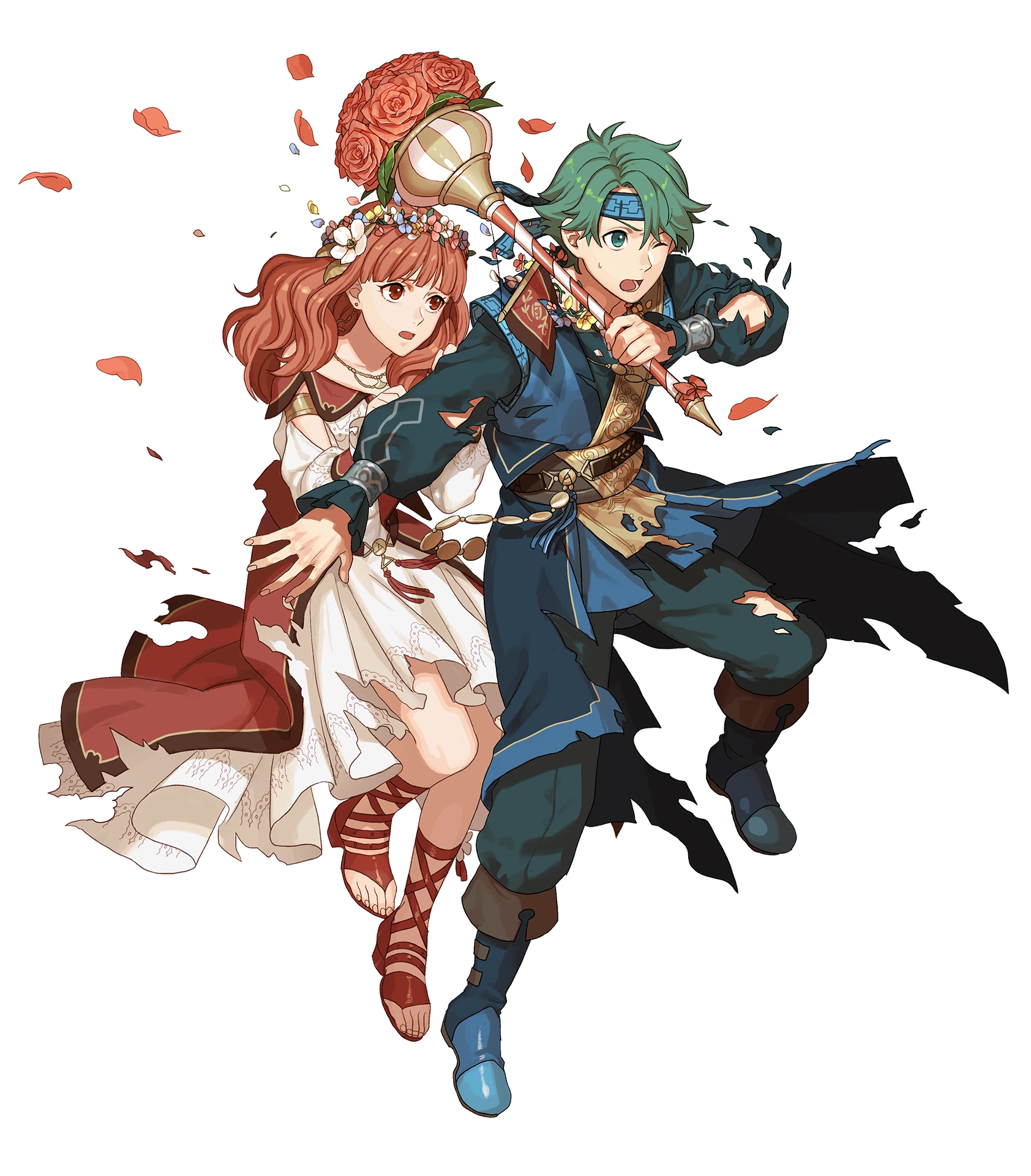 1boy 1girl alm_(fire_emblem) alm_(valentine)_(fire_emblem) alternate_costume belt boots bouquet celica_(fire_emblem) celica_(valentine)_(fire_emblem) couple earrings feet fire_emblem fire_emblem_echoes:_shadows_of_valentia fire_emblem_heroes flower full_body green_eyes green_hair hair_flower hair_ornament headband highres jewelry long_hair necklace nintendo official_art one_eye_closed open_mouth petals red_eyes red_hair sandals teeth toes torn_clothes transparent_background