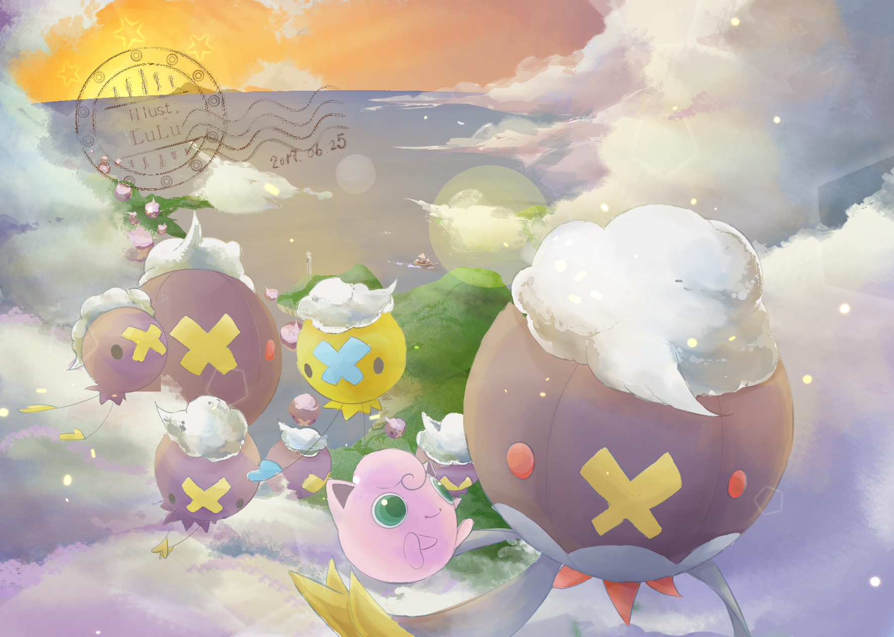 alternate_color artist_name chinese_commentary cloud cloudy_sky commentary_request creature dated drifblim drifloon floating gen_1_pokemon gen_4_pokemon green_eyes highres jigglypuff littlelluu mountain nintendo no_humans ocean pokemon pokemon_(creature) shiny_and_normal shiny_pokemon sky trait_connection twilight water