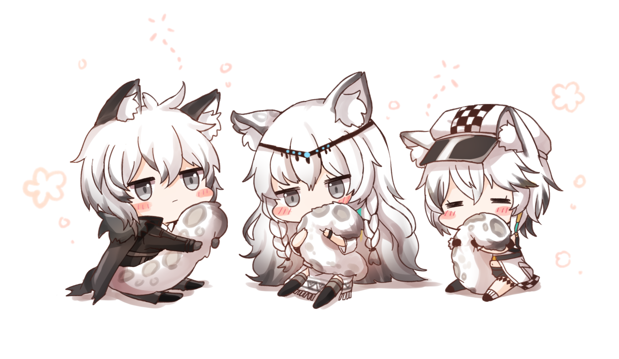 1boy 2girls animal_ear_fluff animal_ears arknights armband biting biting_own_tail black_cape black_gloves black_jacket black_pants braid brother_and_sister cape checkered_clothes checkered_hat chibi cliffheart_(arknights) closed_eyes gloves grey_eyes hand_up hat head_chain highres honyang hugging_own_tail hugging_tail jacket jewelry long_hair long_sleeves multicolored_hair multiple_girls newsboy_cap pants pramanix_(arknights) short_hair siblings silverash_(arknights) sleeveless snow_leopard_ears snow_leopard_tail streaked_hair tail tail_biting twin_braids very_long_hair white_hair