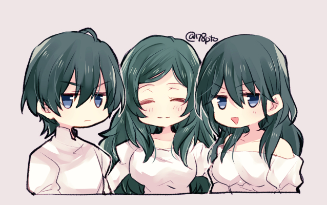1boy 2girls blue_eyes blue_hair closed_eyes closed_mouth female_byleth_(fire_emblem) fire_emblem fire_emblem:_three_houses grey_background long_hair male_byleth_(fire_emblem) medium_hair mother_and_child mother_and_daughter mother_and_son multiple_girls naho_(pi988y) nintendo open_mouth parent_and_child short_hair simple_background sitri_eisner smile twitter_username