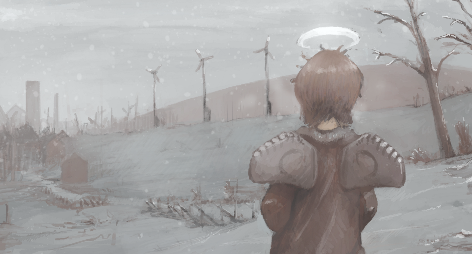 1girl bare_tree brown_hair day drawfag facing_away female_focus haibane_renmei halo highres md5_mismatch outdoors rakka_(haibane_renmei) scenery snow snowing solo traditional_halo tree windmill wings winter