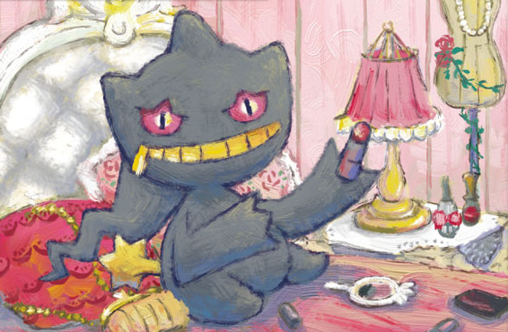 banette bed cosmetics creature gen_3_pokemon grin holding holding_lipstick_tube indoors lampshade lipstick lipstick_tube looking_at_viewer makeup mirror nintendo no_humans official_art pillow pink_eyes pokemon pokemon_(creature) pokemon_tcg sitting smile solo third-party_source yamaki_eri