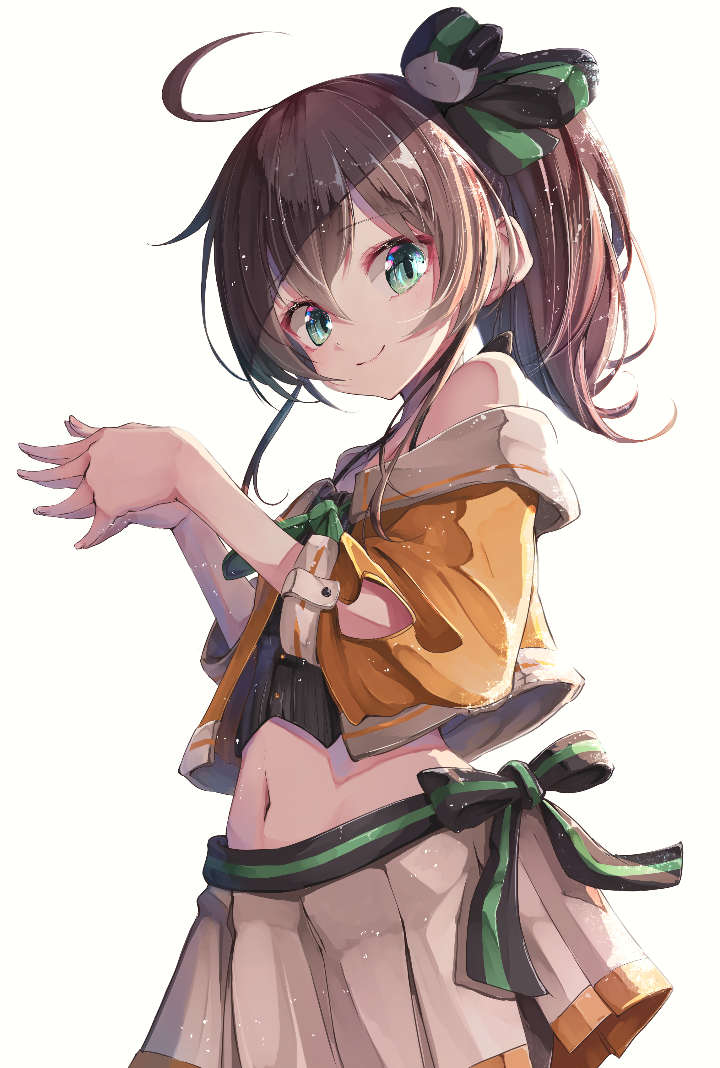 1girl absurdres ahoge bare_shoulders blush brown_hair camisole closed_mouth collarbone cropped_jacket female_focus green_eyes hair_between_eyes highres hololive jacket long_hair looking_at_viewer midriff miniskirt natsuiro_matsuri natsuiro_matsuri_(1st_costume) navel ninniku_mashimashi orange_jacket own_hands_together pinstripe_camisole pinstripe_pattern side_ponytail simple_background skirt smile solo striped virtual_youtuber white_background white_skirt