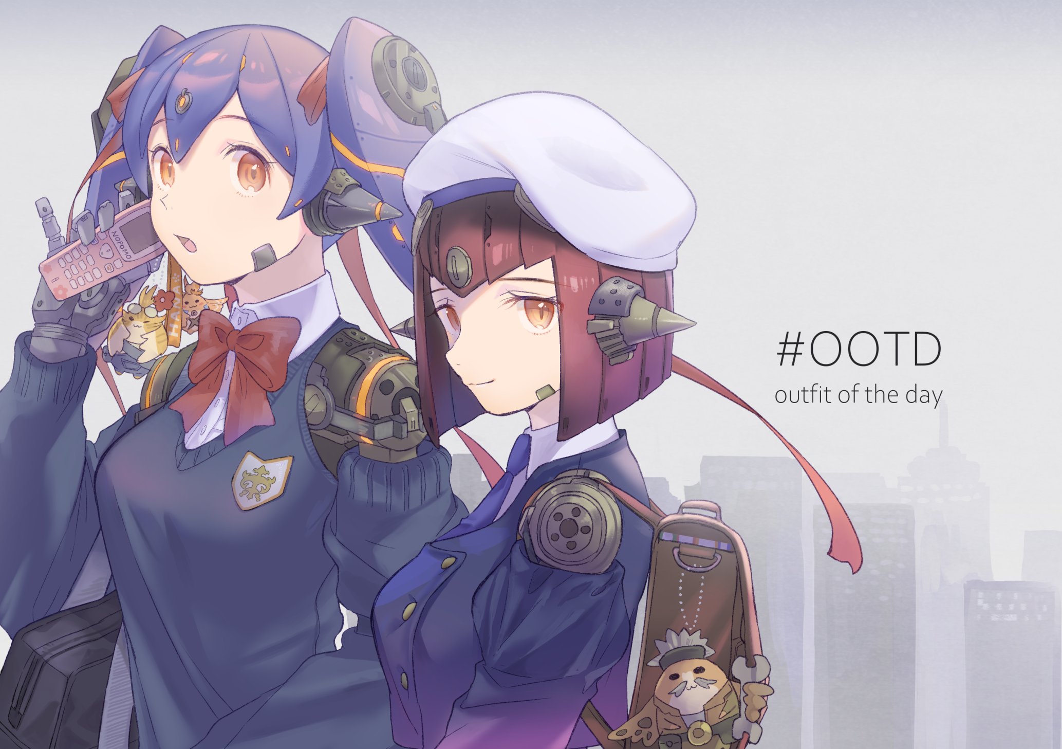 2girls alternate_costume android backpack bag black_hair breasts cellphone contemporary detached_sleeves fujie-yz highres joints lila_(xenoblade) medium_breasts multiple_girls nintendo nopon phone poppi_(xenoblade) poppi_qt_(xenoblade) riki_(xenoblade) robot_ears robot_joints short_hair smile tora_(xenoblade_2) xenoblade_chronicles_(series) xenoblade_chronicles_2