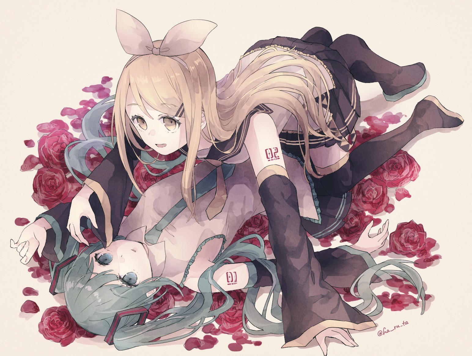 2girls all_fours alternate_hair_length alternate_hairstyle aqua_eyes aqua_hair bare_shoulders belt black_collar black_legwear black_skirt black_sleeves blonde_hair bow collar commentary detached_sleeves flower from_above full_body grey_shirt hair_bow hair_ornament hairclip haruta_(user_dndp3458) hatsune_miku kagamine_rin long_hair looking_at_viewer lying multiple_girls necktie on_back on_flower open_mouth petals rose sailor_collar shirt shoulder_tattoo skirt sleeveless sleeveless_shirt smile swept_bangs tattoo thighhighs twintails very_long_hair vocaloid white_bow white_shirt yellow_eyes yellow_neckwear yuri