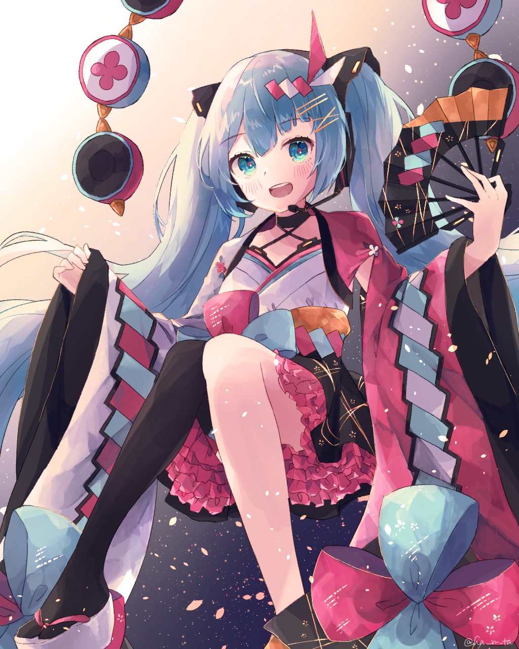 1girl aqua_eyes aqua_hair asymmetrical_legwear black_thighhighs blunt_bangs bow bowtie commentary criss-cross_halter drum female_focus floating floating_object floral_print folding_fan frilled_skirt frills full_body hair_ornament hair_ribbon hairclip halterneck hand_fan haruta_(user_dndp3458) hatsune_miku headphones headset highres holding holding_fan instrument japanese_clothes kimono long_hair looking_at_viewer magical_mirai_(vocaloid) magical_mirai_miku magical_mirai_miku_(2020_summer) open_mouth red_sleeves ribbon sandals single_thighhigh sitting skirt smile solo speaker thighhighs twintails uneven_legwear very_long_hair vocaloid white_sleeves wide_sleeves yukata zouri