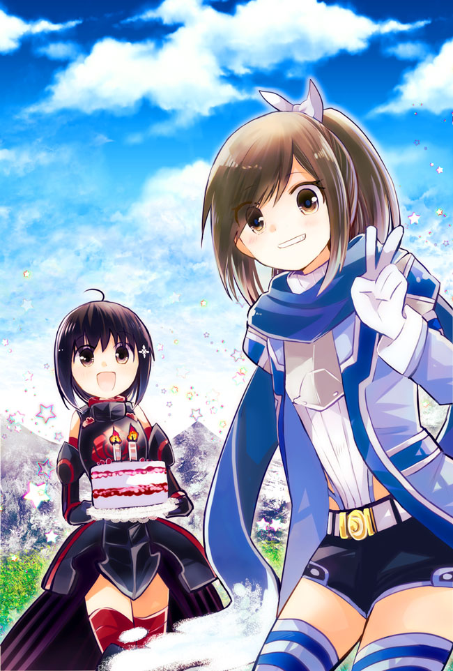 2girls :d ahoge armor belt black_armor black_hair black_shorts blue_neckwear blue_thighhighs bob_cut boots brown_eyes brown_hair cake candle cloud commentary_request day foliage food gauntlets gloves grin hair_ornament hair_ribbon highleg holding holding_cake holding_food itai_no_wa_iya_nano_de_bougyoryoku_ni_kyokufuri_shitai_to_omoimasu looking_at_viewer maple_(bofuri) medium_hair mountain multiple_girls oimoto_jirou open_mouth parted_bangs ponytail red_legwear ribbon sally_(bofuri) scarf shield short_hair shorts sky smile sparkle star_(symbol) thigh_boots thighhighs v white_armor white_belt white_gloves white_ribbon zettai_ryouiki