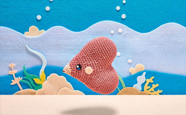 amigurumi_(medium) animal_focus asako_ito bubble commentary creature english_commentary fish from_side full_body gen_3_pokemon luvdisc nature nintendo no_humans outdoors photo_(medium) pokemon pokemon_(creature) pokemon_tcg profile seaweed shadow solo swimming third-party_source unconventional_media underwater water