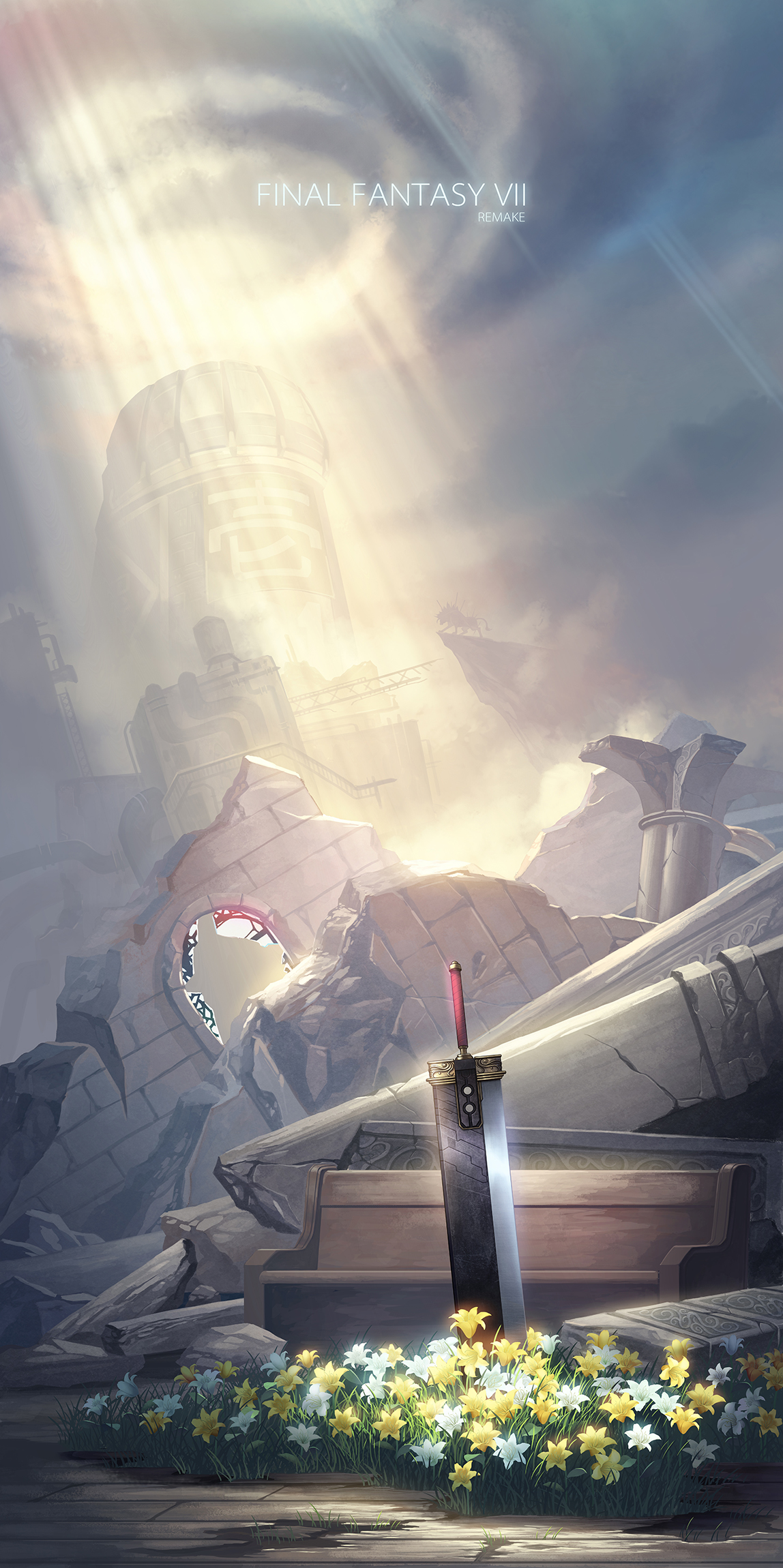 bad_id bad_pixiv_id bench broken_glass buster_sword cloud cloudy_sky copyright_name destruction diamond_dust_(omega) final_fantasy final_fantasy_vii final_fantasy_vii_remake flower glass highres light_rays lily_(flower) no_humans outdoors overcast plant ruins scenery sky smoke sunlight sword tower weapon wooden_floor