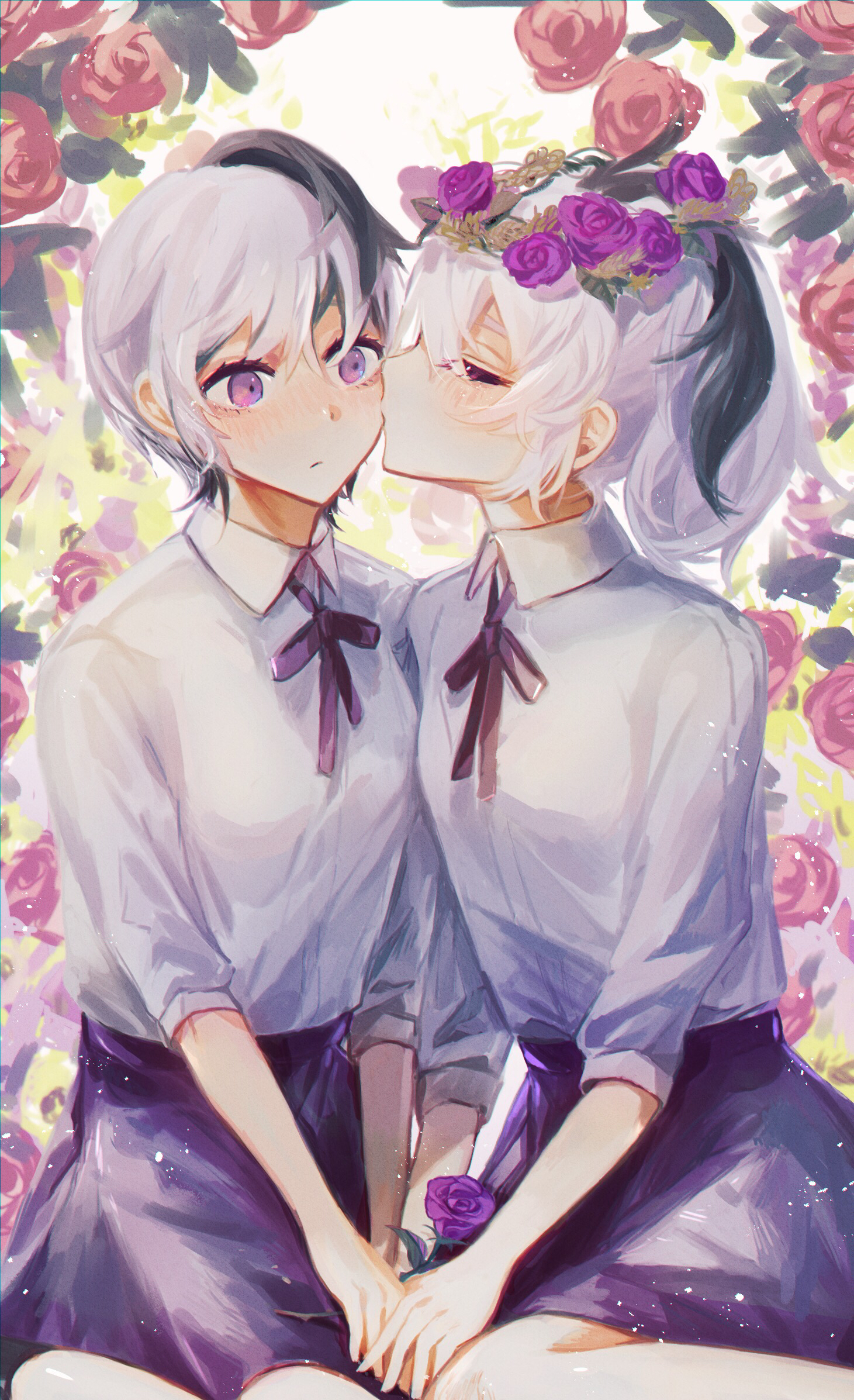 2girls closed_eyes dual_persona floral_background flower flower_(vocaloid) flower_(vocaloid3) flower_(vocaloid4) flower_wreath highres holding_hands kiss kissing_cheek leaf medium_hair miniskirt multicolored_hair multiple_girls neck_ribbon purple_eyes purple_flower purple_hair purple_ribbon purple_rose purple_skirt qq_orikou red_flower red_rose ribbon rose selfcest shirt short_hair sitting skirt streaked_hair vocaloid wariza white_hair white_shirt yuri