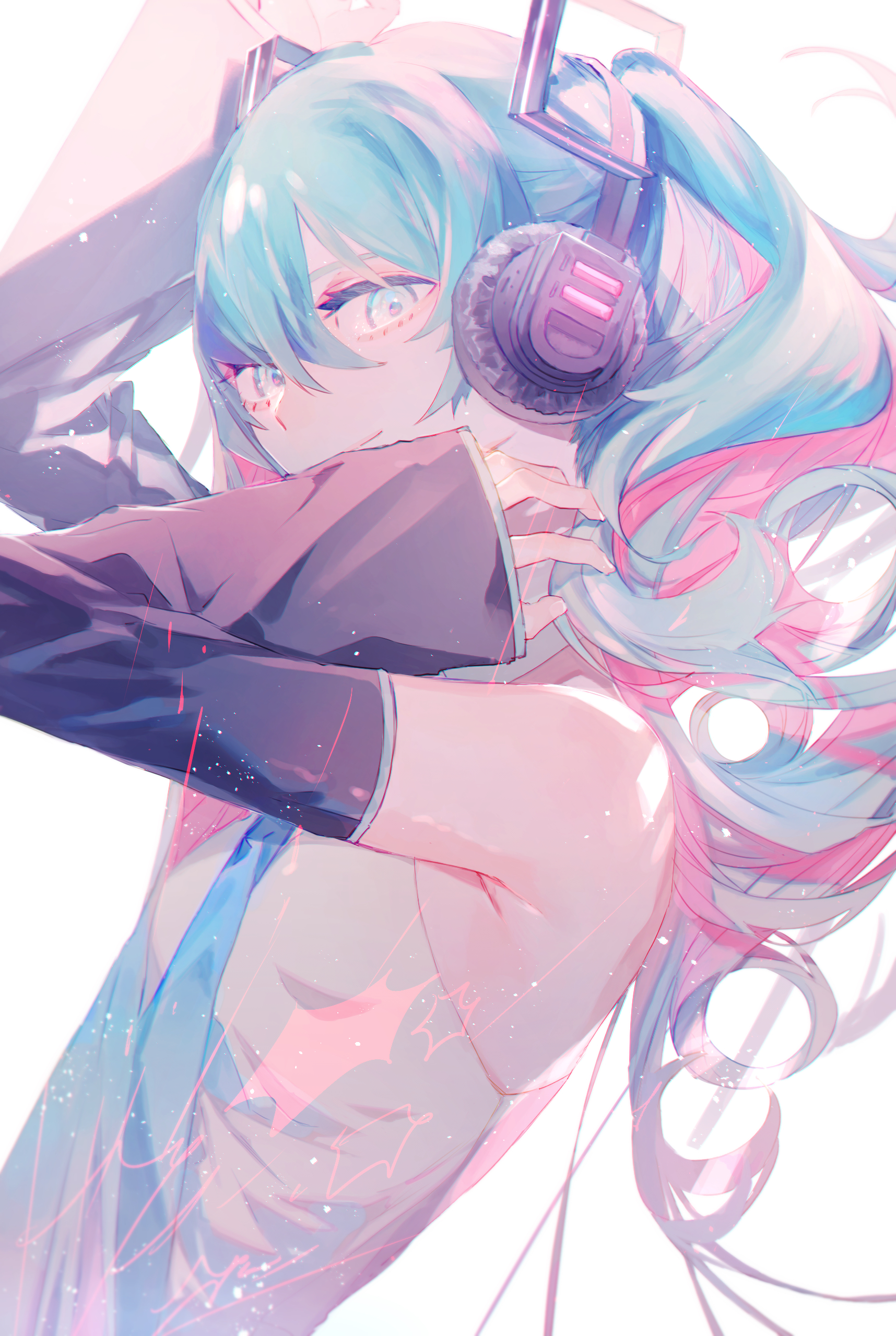 1girl absurdres aqua_eyes aqua_hair aqua_necktie bare_shoulders black_sleeves commentary detached_sleeves female_focus hand_on_own_neck hands_up hatsune_miku head_tilt headphones highres light_particles long_hair looking_at_viewer necktie qq_orikou shirt sidelighting sleeveless sleeveless_shirt smile solo twintails upper_body vocaloid white_background
