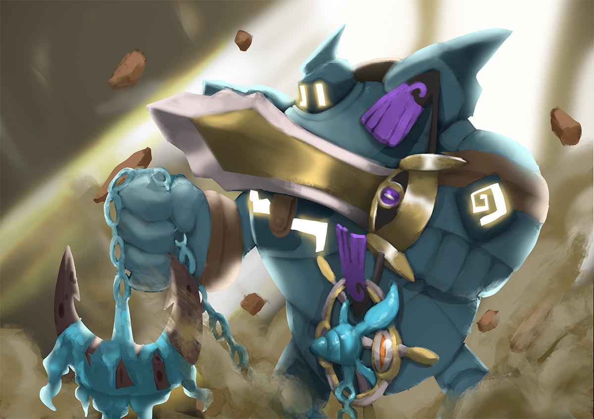 aegislash anchor atorot chain commentary_request creature dhelmise gen_5_pokemon gen_6_pokemon gen_7_pokemon golurk holding holding_chain holding_pokemon holding_sword holding_weapon nintendo no_humans pokemon pokemon_(creature) rock standing sword weapon