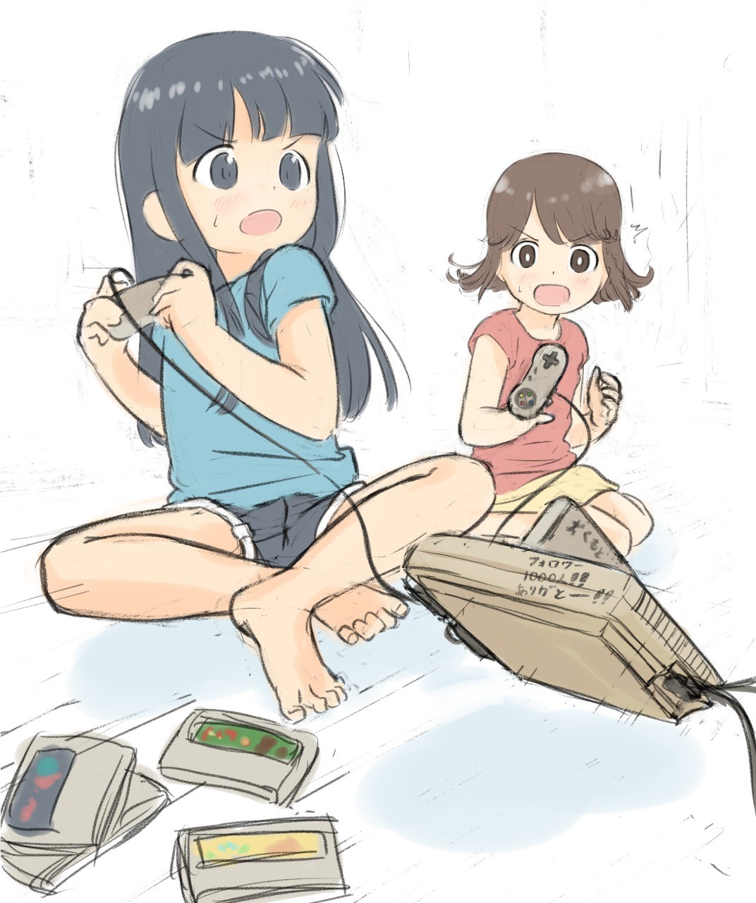 2girls game_console game_controller highres mentosutanaka multiple_girls super_famicom super_famicom_cartridge super_famicom_controller translated