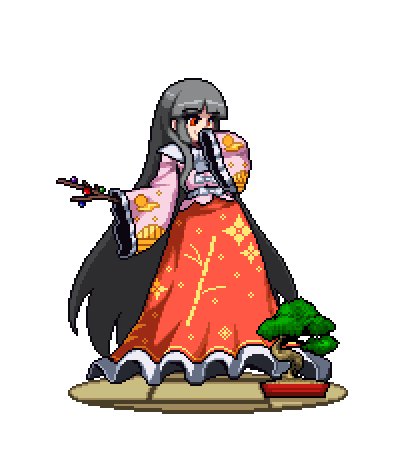 1girl absurdly_long_hair antinomy_of_common_flowers black_hair bonsai bow branch closed_mouth collared_shirt covering_own_mouth female_focus floral_print frilled_skirt frilled_sleeves frills full_body hime_cut houraisan_kaguya japanese_clothes jeweled_branch_of_hourai long_hair long_skirt long_sleeves lowres moon_print official_style pink_shirt pixel_art plant potted_plant red_eyes red_skirt sash shirt sidelocks skirt sleeves_past_wrists smile solo star_(symbol) the_hammer_(pixiv30862105) touhou transparent_background tsukasa_(ilqmplim) very_long_hair very_long_sleeves white_bow wide_sleeves