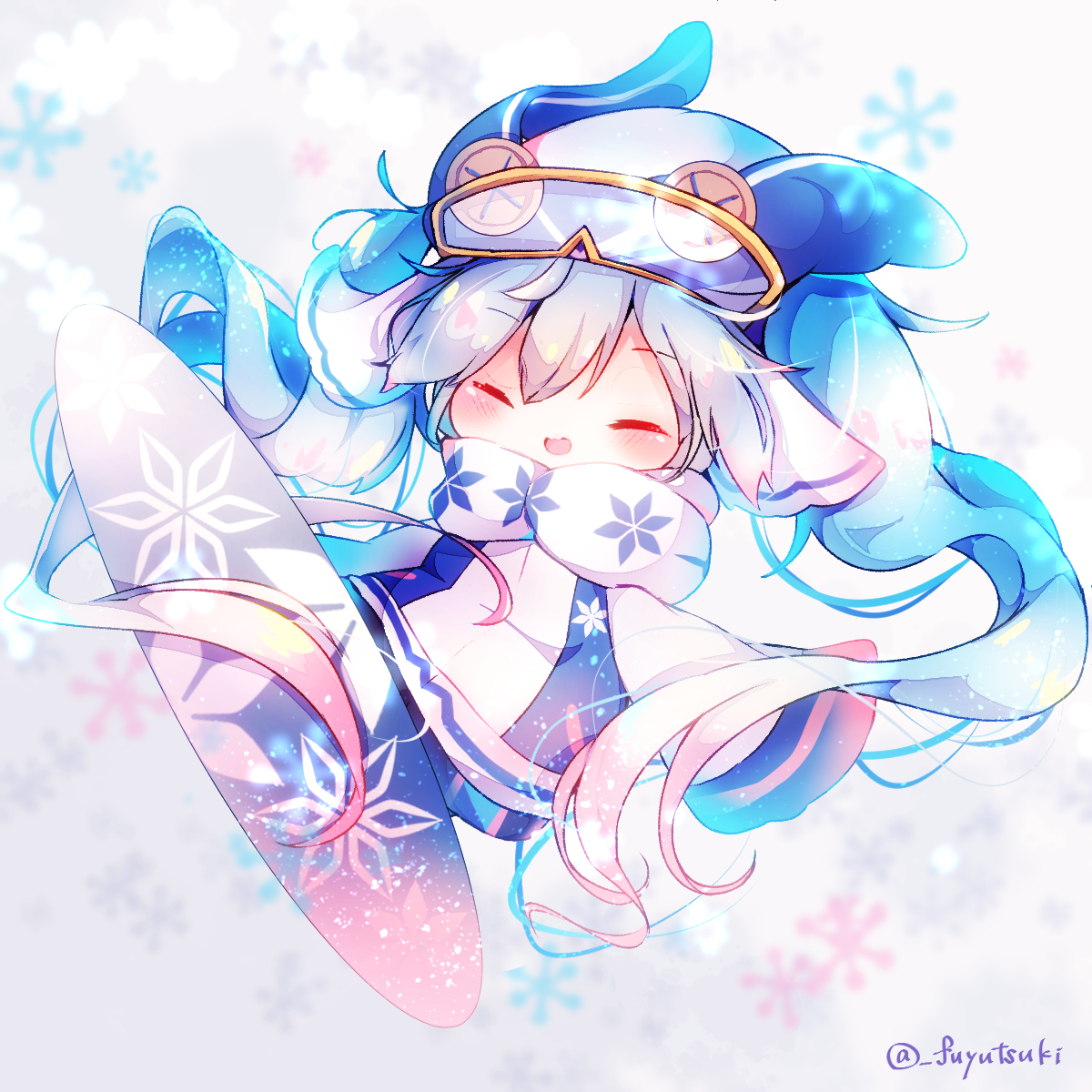 1girl blue_hair blush button_eyes buttons chibi closed_eyes coat female_focus fuyuzuki_gato goggles hatsune_miku highres light_blue_hair long_hair multicolored_coat open_mouth owl_ears ski_gear smile snowboard snowboarding snowflake_background snowflake_print snowflakes solo twintails twitter_username two-tone_coat very_long_hair vocaloid white_coat yuki_miku yuki_miku_(2016)