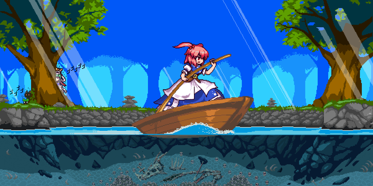 4girls aura belt bird blue_background boat bone bow cat commentary dark_aura day dress grass green_bow green_hair hair_bobbles hair_ornament hat holding impending_doom kaenbyou_rin kaenbyou_rin_(cat) layered_skirt light_rays medium_hair multiple_girls onozuka_komachi open_mouth outdoors partially_underwater_shot peeking_out pixel_art puffy_short_sleeves puffy_sleeves red_eyes red_hair red_ribbon reiuji_utsuho reiuji_utsuho_(bird) ribbon ribs rock scenery shiki_eiki short_sleeves skirt skull the_hammer_(pixiv30862105) touhou tree two_side_up underwater water watercraft white_ribbon