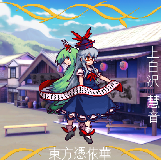 2girls :d antinomy_of_common_flowers architecture back-to-back bench black_footwear blue_dress bottle bow character_name closed_mouth cloud collared_dress commentary day dress dual_persona east_asian_architecture ex-keine expressionless footwear_bow glasses green_dress green_hair grey_hair hat hat_bow holding holding_scroll horn_bow horn_ornament horn_ribbon horns house human_village_(touhou) kamishirasawa_keine lantern long_hair mountain multiple_girls official_style open_mouth outdoors pinafore_dress pixelated puffy_short_sleeves puffy_sleeves red_bow red_eyes red_neckwear red_ribbon ribbon rooftop scroll shadow shirt shoes short_sleeves sidelocks sign sleeveless_dress sliding_doors smile socks table the_hammer_(pixiv30862105) tokin_hat touhou translated white_legwear white_shirt wooden_wall