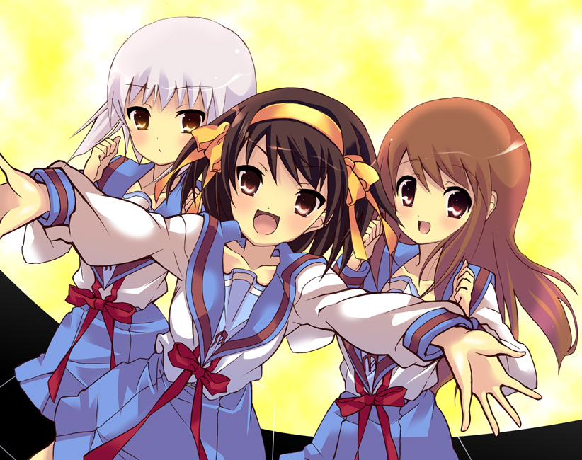 00s 3girls asahina_mikuru brown_hair hairband long_hair multiple_girls nagato_yuki red_eyes school_uniform serafuku short_hair suzumiya_haruhi suzumiya_haruhi_no_yuuutsu yellow_eyes yuutarou