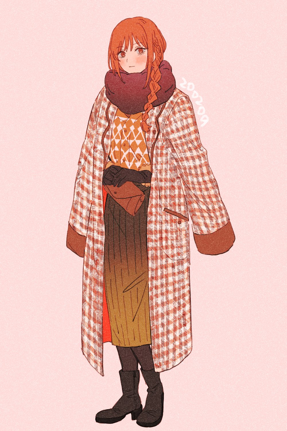 1girl alternate_costume bag black_boots black_gloves black_legwear blush boots braid chainsaw_man closed_mouth coat dated female_focus full_body gloves gradient_clothes gradient_skirt handbag highres hmng jacket jacket_on_shoulders long_skirt looking_at_viewer makima_(chainsaw_man) medium_hair orange_eyes orange_hair orange_skirt own_hands_together patterned_clothing pink_background plaid_clothes plaid_coat red_scarf ribbed_skirt scarf shirt simple_background skirt solo standing