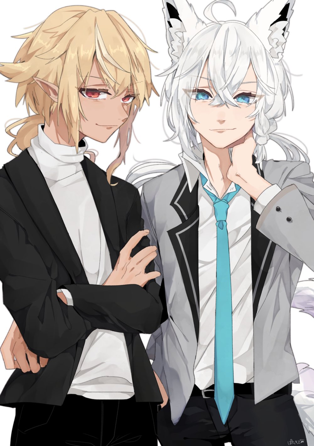2boys ahoge animal_ear_fluff animal_ears april_fools blonde_hair blue_eyes commentary_request crossed_arms dark-skinned_female dark_elf dark_skin elf fox_ears genderswap genderswap_(ftm) hair_between_eyes hand_on_own_neck highres ho/laurent hololive hololive_fantasy hololive_gamers long_sleeves looking_at_viewer male_focus multiple_boys necktie pochimoto pointy_ears red_eyes shirakami_fubuki shirakami_fubuki_(ho/laurent) shiranui_flare shiranui_homura simple_background virtual_youtuber white_background white_hair
